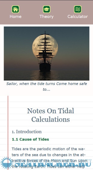 Our theory section contains some important notes on tides. Cause and types of tides are explained, together with effect of shallow waters and meteorological conditions like wind and barometric pressure.