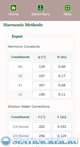 Secondary port tool and Tidal stream tool come with a harmonic calculation method and graphical result plot. This method is based on the 4 principal harmonic constituents as explained in the theory section of the app. These are very powerful tools, allowing to use tidal angles and factors.