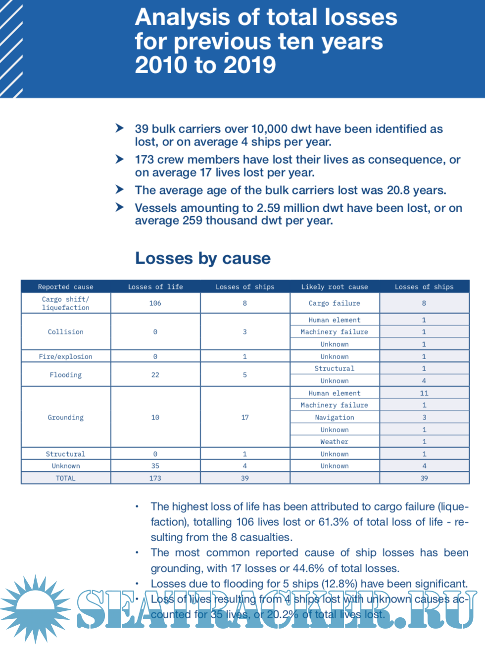 Year: 2020 Language: english Author: Intercargo Genre: Other Publisher: Intercargo Format: PDF Quality: eBook Pages count: 28 Description: The loss of the bulk carrier Nur Allya in August 2019 cast a shad- ow over the industry’s excellent safety performance throughout the previous year, during which no bulk carrier casualties were report- ed. This incident alone clearly demonstrates that there is no room for complacency, and INTERCARGO calls for a prompt and thor- ough investigation into this tragic loss. It is only through effective root cause analysis that appropriate corrective actions can be put in place to ensure that such an accident never happens again. Lessons learned from past incidents play an important role in de- termining where additional safety improvements are necessary both at an industry and an international level. To this end the prompt publication of thorough and complete casualty investigation re- ports remains a key objective of the industry. It is vitally important that casualty investigation reports are submitted to the Internation- al Maritime Organization (IMO) in a timely manner so that the root causes of serious incidents can be properly identified and the appropriate corrective ac- tions taken. The industry finds it difficult to accept that only 24, or about 62%, of a total of 39 bulk carrier losses had their investigation reports made available on the IMO Global Integrated Shipping Information System (GISIS) data- base at the end of January 2020. The aver- age time from incident to a report becoming available has been 32 months for these investigations.