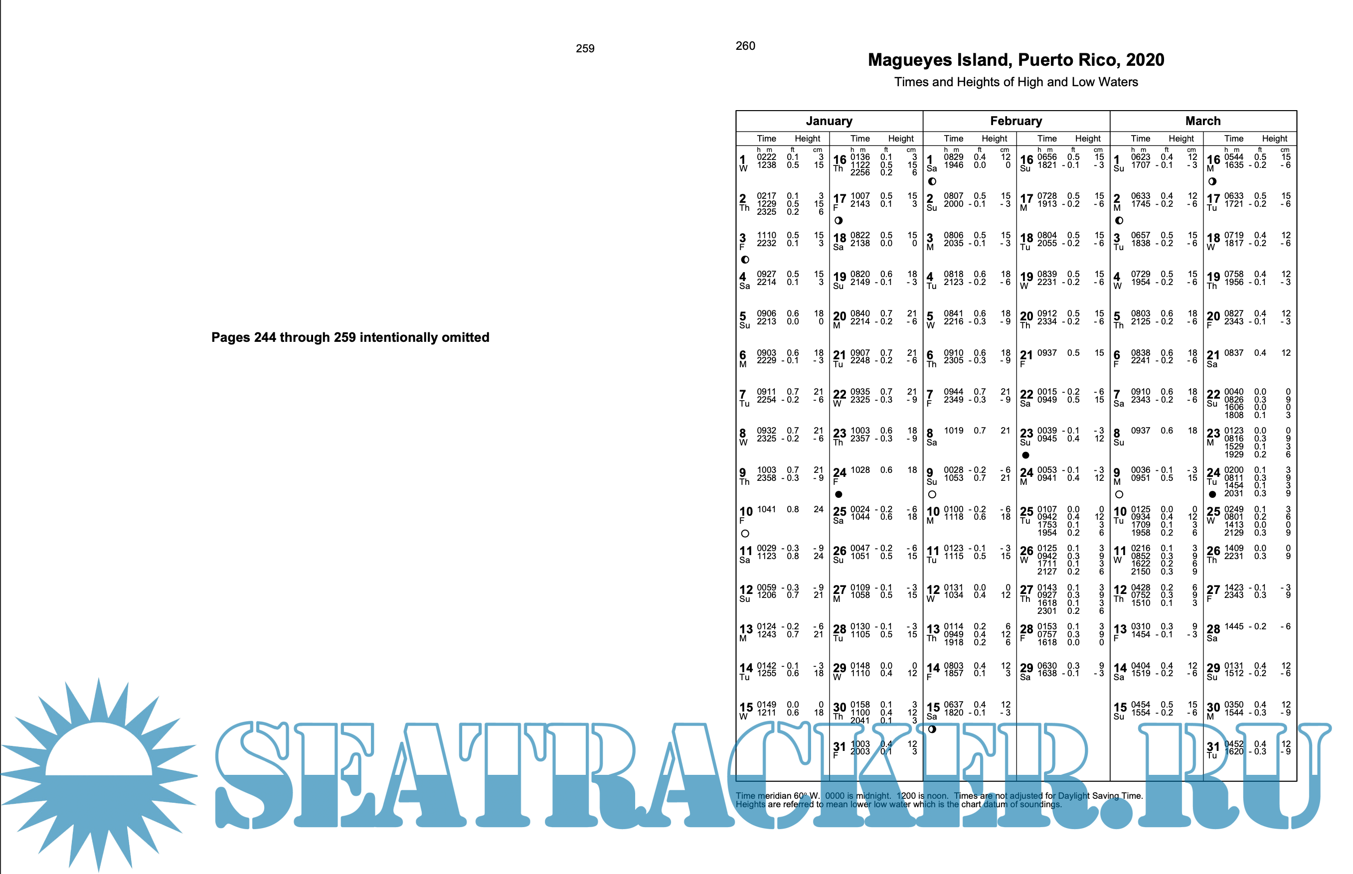 Description: Contains full daily predictions for 76 reference ports and differences and other constants for about 2,600 stations in North America, South America, and Greenland. It also contains a table for obtaining the approximate height of the tide at any time, a table of local mean time of sunrise and sunset for every 5th day of the year for different latitudes, a table for the reduction of local mean time to standard time, a table of moonrise and moonset for 8 places, a table of the Greenwich mean time of the Moonsí phases, apogee, perigee, greatest north and south and zero declination, and the time of the solar equinoxes and solstices, and a glossary of terms. This book comes is published as one part in a set of four volumes, along with Europe and West Coast of Africa (including the Mediterranean Sea)
