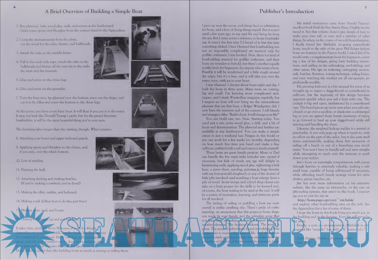 Year: 2002 Language: english Author: Jim Michalak Genre: Handbook Publisher: Breakaway Books Edition: First ISBN: 1891369296 Format: PDF Quality: Scanned pages Pages count: 240 Description: This book takes the complete novice--armed only with a gleam in the eye, and a basic knowledge of hammer, saw, and screwdriver--and walks him or her through the process of building a boat. The only materials needed are easily available from any lumberyard: plywood, 2x4s, nails, and wood glue. The process is simple, the result is extraordinary--your own boat, ready to sail, in just a week or two, for a fraction of the cost of buying a factory-built (boring!) boat. And the sense of accomplishment is beyond compare. The main focus of the book is on building the 14-foot sailing/rowing skiff called "Mayfly." Full plans and detailed step-by step instructions are given, with numerous line drawings and photographs. Those instructions can then be applied to the other full plans included: for a dinghy, a motorboat, a rowboat, a canoe, and two other sailboats. The only other book to compare is Harold Payson’s venerable Build the New Instant Boats. But where that book leaves off, this book goes beyond: with chapters on making your own oars, making kick-up rudders, pivoting leeboards, sails, flotation compartments, water ballast, hatches, and tips for cartopping and trailering your boat, and much more. It is an introductory book that will continue to be pored over as the beginner transforms himself or herself into an experienced boatbuilder. Also included are a catalog of twenty other boat plans for dreaming over, a guide to boatbuilding sites on the web, a guide to materials suppliers, and a bibliography of further reading. A great book for families, for scout groups, for school shop classes, for anyone who enjoys messing about in boats. Jim Michalak is a former aerospace engineer who has become, in the last decade, one of the foremost designers of small boats in America. He lives in Lebanon, Illinois. Additional info: From the Publisher This book is an extraordinary value -- full building plans for six different boat, and clear, methodical instruction to help anyone build their first boat. Over a hundred photos and drawings to illustrate the process. Full building plans included for: Mayfly: 14' sailboat Piragua: 13' pirogue, or simple canoe QT Skiff (rowing version): 13' rowboat QT Skiff (motor version): 13' motorboat Jonsboat: 16' jonboat Robote: 14' taped-seam rowboat