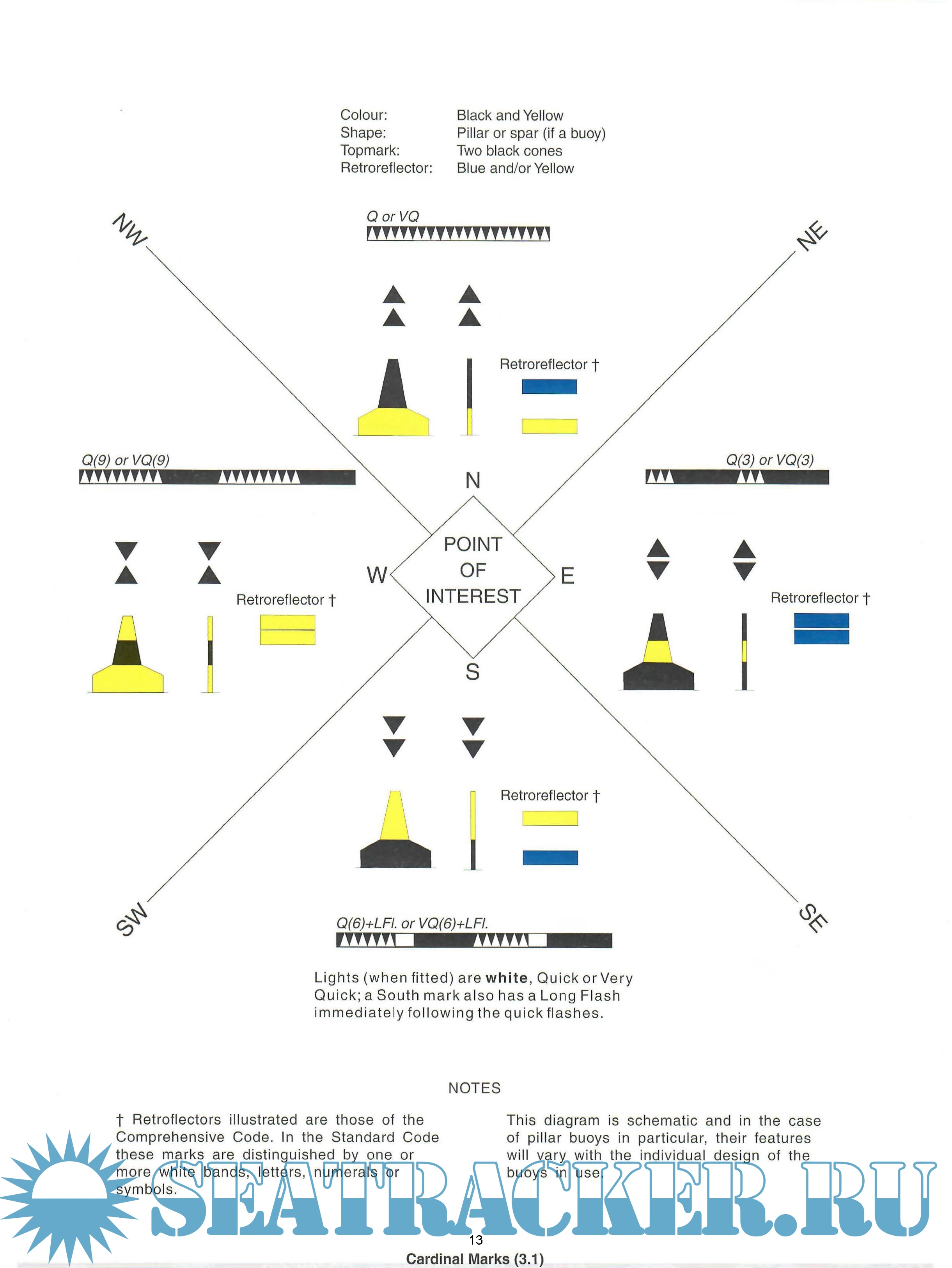 Description: Combined Cardinal and Lateral System (Red to port in Region A and red to starboard in Region B).