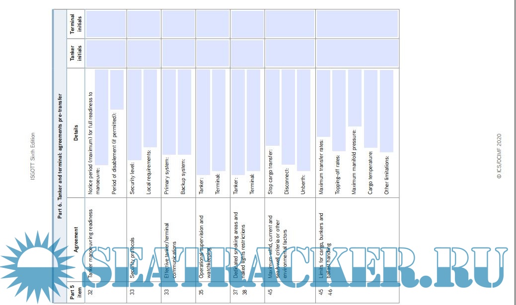 Year: 2020 Language: english Author: OCIMF, ICS, IAPH Genre: Other Publisher: Witherby Publishing Group Edition: 6th Format: PDF Quality: OCR without errors Pages count: 15 Description: Before cargo loading /discharging cargo from a tanker vessel Chief officer and the loading master goes through a safety checklist commonly known as "Ship-Shore safety checklist". The format of the checklist is provided in the ISGOTT (6th edn) which is also included in the SMS manual of the concerned company. There are some items in the checklist which are jointly checked by ship and the terminal representative and those items including items required to be checked individually are included in the checklist.