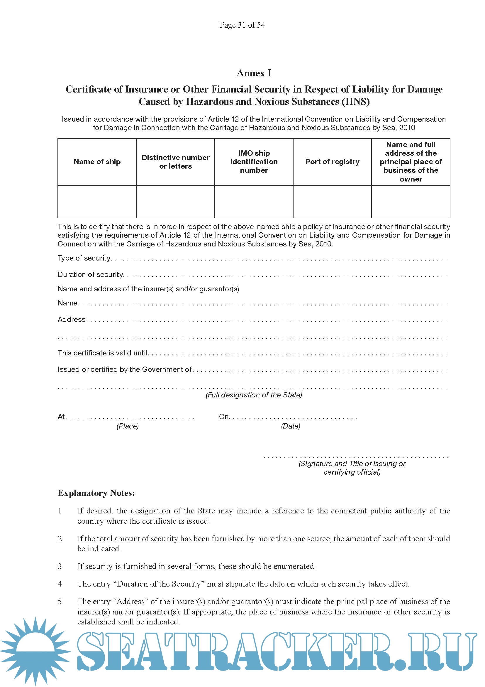 Page 31 - Annex I - Certificate of Insurance or Other Financial Security in Respect of Liability for Damage Caused by Hazardous and Noxious Substances (HNS)