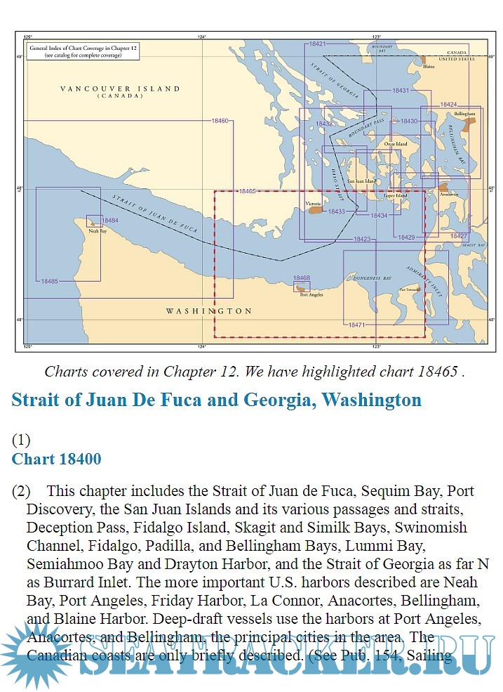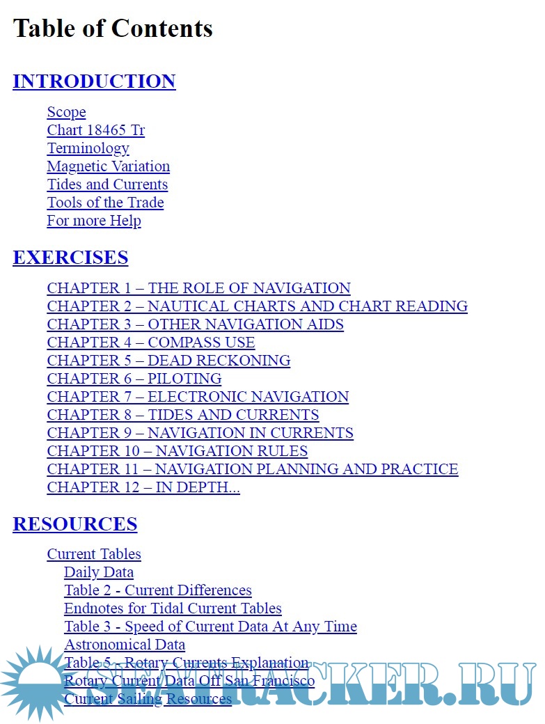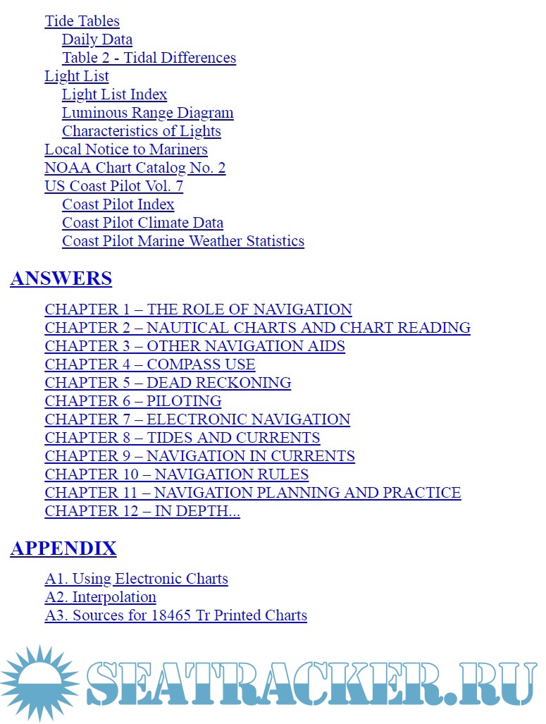 Some exercises require the NOAA training chart 18465 Tr, "Strait of Juan de Fuca, Eastern Part". This paper chart is frozen in time to about 1998, and is available at chart dealers or online, but is otherwise similar to the standard navigation chart of this region NOAA 18465, provided in the same folder of the book. Except for this paper chart, all other resource materials are provided in the Resources section of the book, which includes excerpts for all publications needed.