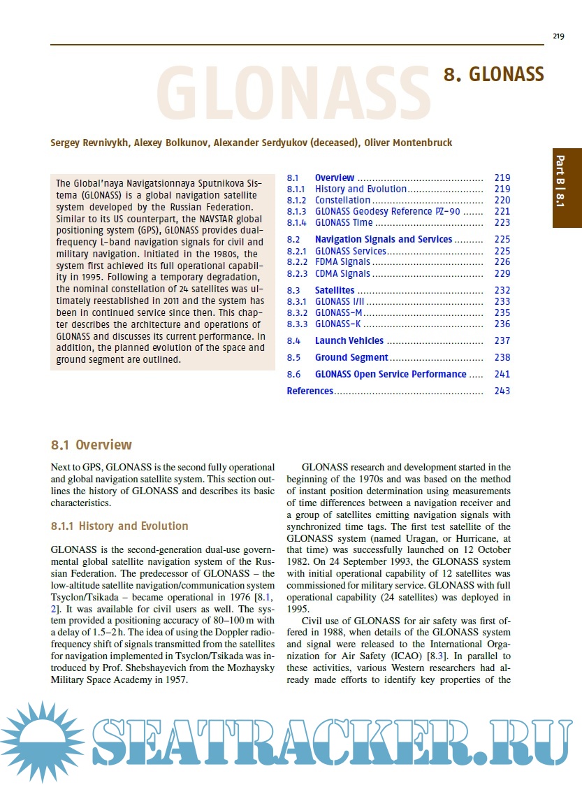 Year: 2017 Language: english Author: Various Authors Genre: Manual Publisher: Springer International Publishing ISBN: 978-3-319-42926-7 Format: PDF Quality: eBook Pages count: 1335 Description: This Handbook is a complete and rigorous presentation of the fundamentals, methods and applications of the Global Navigation Satellite Systems, a reference work and a state-of-the-art description of GNSS. All global and regional satellite navigation systems (GPS, GLONASS, Galileo, BeiDou, QZSS, IRNSS/NAVIC, SBAS) are examined in detail. The functional principles of receivers and antennas, as well as the advanced algorithms and models for GNSS parameter estimation, are discussed. The book is divided in seven distinct parts, each comprising a set of four to eight individual chapters with a common range of topics. For example part A covers the basics of GNSS, in part B one can find a description of all the global, regional, and augmentation systems. Part C presents signal processing, receivers, and antennas. Part D deals with the modern achievements in GNSS algorithms, while part E shows the classical absolute and differential positioning, as well as all the new achievements in precise point positioning and GNSS/INS integration. Part F is dedicated to surveying, geodesy and geodynamics, and Part G to remote sensing and timing. Each of the 41 chapters contains a list of references, from which the reader can deepen the topics. Two annexes show the different receiver and data formats and outline the various GNSS parameters.