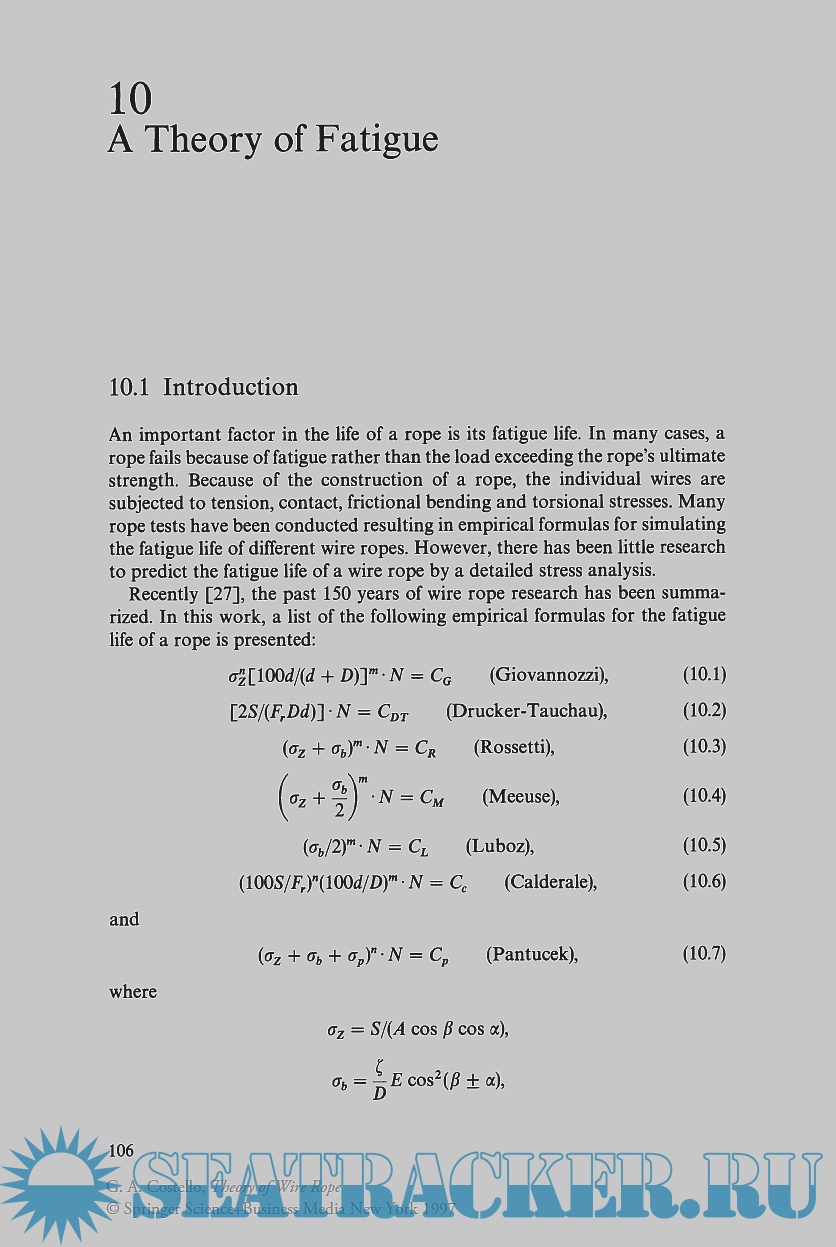 Year: 1997 Language: english Author: George A. Costello Genre: Manual Publisher: Springer Edition: 2nd ISBN: 978-1-4612-7361-5 Format: PDF Quality: eBook Pages count: 135 Description: This manual deals with the analysis of the static behavior of wire ropes under different loading conditions, and with the various theories of the fatigue. In recent years, considerable progress has been made in the development of models used to predict the response of ropes. Since there are so many parameters that can vary in the construction of a rope, such models can be used to determine the effects of possible variations of these parameters on the performance of a rope. Numerous examples are worked out to illustrate the theory, and the test results discussed. This second edition includes new chapters on tension and compression of a cord, fatigue, and assumptions and approximations used. Topics are treated with a clear language and many details of the solution steps are given; most of the cases are clarified by numerical examples. The book's aim is to be a comprehensive theoretical review of the mechanical behavior of wireropes, that can also be seen as a good handbook for those who are interested in practical design and evaluation of stresses in ropes with any geometry and cross-section.
