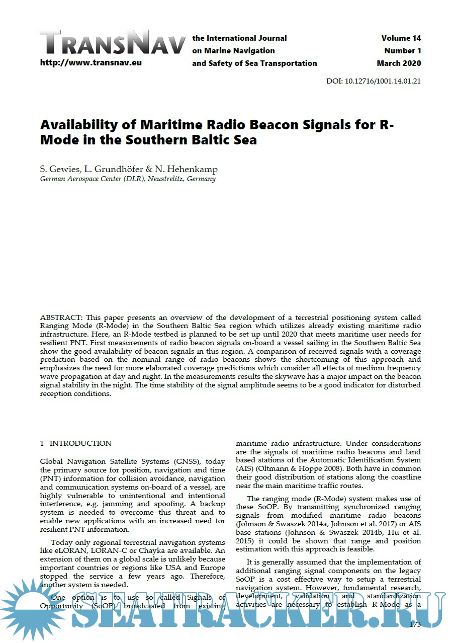 Year: 2020 Language: english Author: S. Gewies, L. Grundhöfer Genre: Research papers Publisher: TransNav Format: PDF Quality: eBook Pages count: 6 Description: Article from TransNav, the International Journal on Marine Navigation and Safety of Sea Transportation, Vol 14, No. 1, march 2020. This paper presents an overview of the development of a terrestrial positioning system called Ranging Mode (R-Mode) in the Southern Baltic Sea region which utilizes already existing maritime radio infrastructure. Here, an R-Mode testbed is planned to be set up until 2020 that meets maritime user needs for resilient PNT.