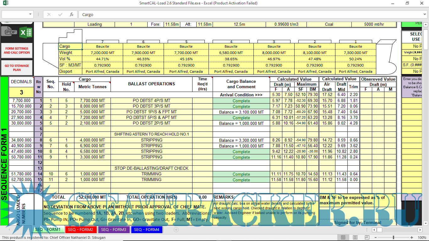 Load/ Disch Sequence - prepare your loading or discharging sequence with ease using these forms. You will no longer need to compute the cargo balance per sequence as the value of your cargo balance will appear in the Cargo Balance and Comment section. Your vessel's Air Draft will be shown per hatch in the Air Draft Calculation section and the highlighted value can be sent into the form. It also features the error checking for Cargo Quantity and completed Cargo Holds. The incomplete holds and each cargo quantity remaining to be loaded or discharged will be indicated for your attention. The prepared SEQUENCE can be printed in greyscale or in color, exported into PDF, and Excel (.xlsb) format. Exported excel format gives you the freedom to edit the form appearance to your liking.