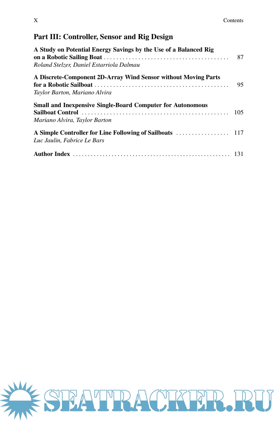 Year: 2013 Language: english Author: Sauzé C., Finnis J. (eds.) Genre: Conference Publisher: Springer-Verlag Berlin Heidelberg Edition: 1st ISBN: 978-3-642-33084-1 Format: PDF Quality: Scanned pages Pages count: 131 Description: Robotic sailing offers the potential of wind propelled vehicles which are sufficiently autonomous to remain at sea for months at a time. These could replace or augment existing oceanographic sampling systems, be used in border surveillance and security or offer a means of carbon neutral transportation. To achieve this represents a complex, multi-disciplinary challenge to boat designers and naval architects, systems/electrical engineers and computer scientists. Since 2004 a series of competitions in the form of the Sailbot, World Robotic Sailing Championship and Microtransat competitions have sparked an explosion in the number of groups working on autonomous sailing robots. Despite this interest the longest distance sailed autonomously remains only a few hundred miles. Many of the challenges in building truly autonomous sailing robots still remain unsolved. These proceedings present the cutting edge of work in a variety of fields related to robotic sailing. They will be presented during the 5th International Robtoic Sailing Conference, which is taking place as part of the 2012 World Robotic Sailing Championships.