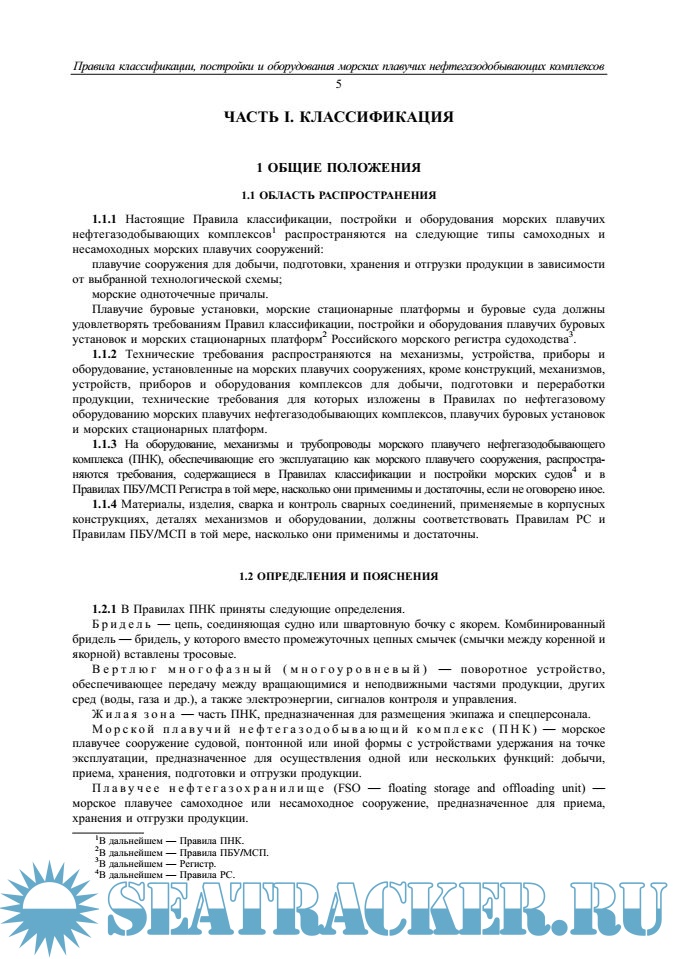 Настоящие Правила устанавливают требования, являющиеся специфичными для ПНК и учитывают рекомендации Кодекса ИМО по конструкции и оборудованию ПБУ, принятого Ассамблеей ИМО 19 октября 1989 г. (резолюция ИМО А.649(16)), международный опыт создания и эксплуатации ПНК, требования правил иностранных классификационных обществ, международных стандартов, а также опыт Российского морского регистра судоходства по классификации и постройке судов, плавучих буровых установок и морских стационарных платформ, изложенный в соответствующих правилах.