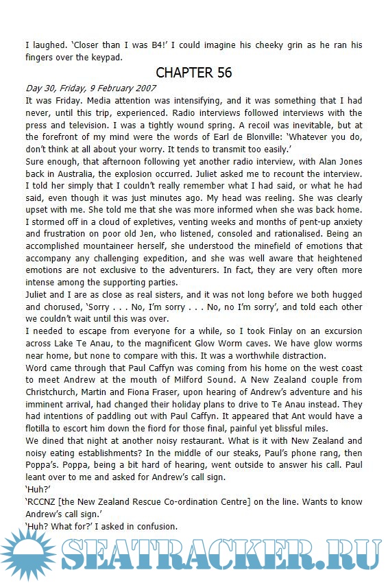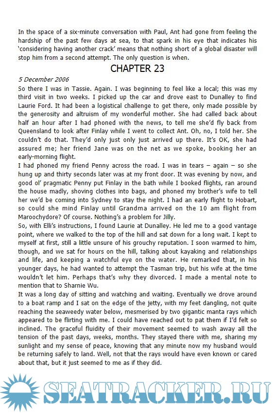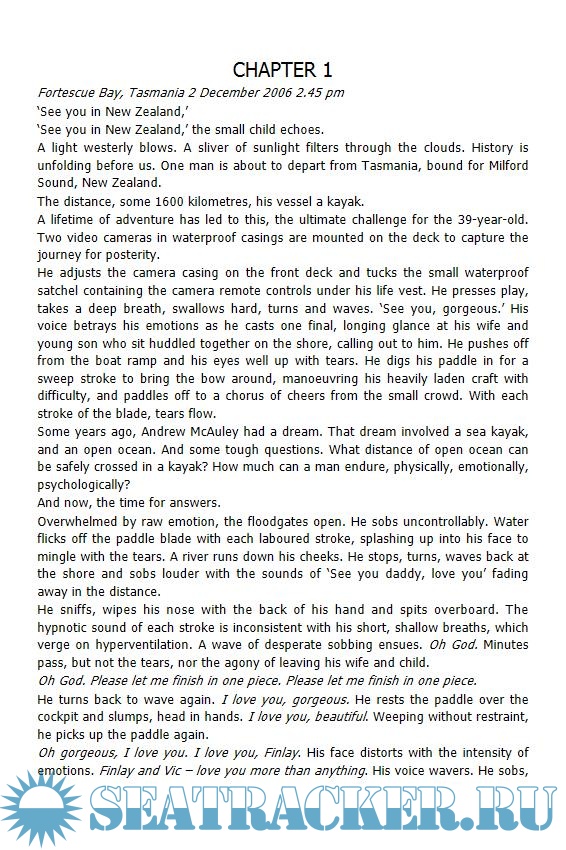 Description: On January 11th 2007, Andrew McCauley set off from Tasmania in a sea Kayak, aiming to be the first person to paddle the 1600 kms to New Zealand. A month later, NZ authorities received a garbled distress call from him. His Kayak was spotted drifting just 80 kms from NZ. His wife writes his adventure story.