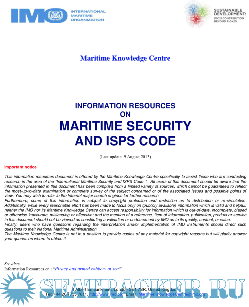 Description: This information resources document is offered by the Maritime Knowledge Centre specifically to assist those who are conducting research in the area of the “International Maritime Security and ISPS Code ”. All users of this document should be aware that the information presented in this document has been compiled from a limited variety of sources, which cannot be guaranteed to reflect the most-up-to-date examination or complete survey of the subject concerned or of the associated issues and possible points of view. You may wish to refer to the Internet major search engines for further research.