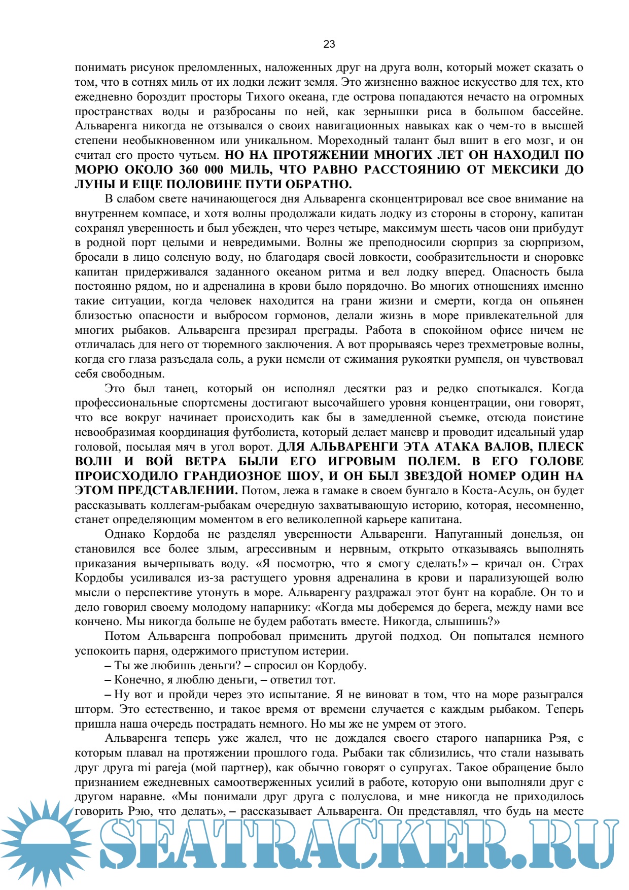 Описание: Как долго можно выжить в открытом море, без средств связи, еды и пресной воды? Неделю? Месяц? Год?... Опытный рыбак на акул Альваренга и его помощник 22-летний мексиканец Кордоба отправились ловить акул, но попали в жуткий шторм. Мотор вышел из строя, и их лодку унесло в открытый океан. Без еды, снастей и пресной воды им только и оставалось как дрейфовать на волнах и надеятся на чудо... А ровно через 438 дней жители атолла Эбон, входящего в состав Маршалловых островов и находящегося в 10 000 километров от Мексики, заметили рядом со своим жилищем худого мужчину в разодранной одежде и обросшего густой бородой... Эта история так поразительна, что некоторые до сих пор не верят в ее подлинность. Но правда порой оказывается гораздо невероятнее реальности.