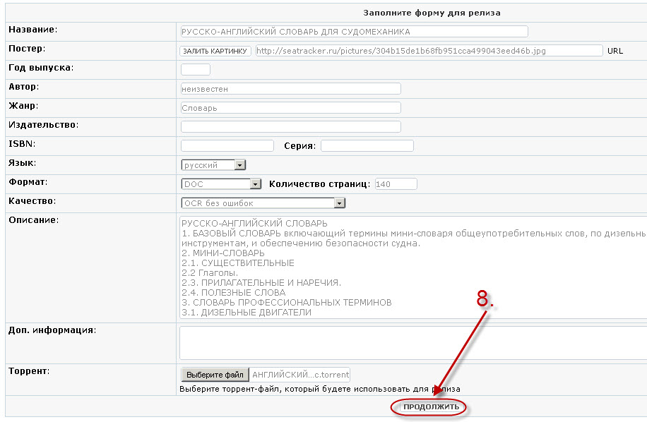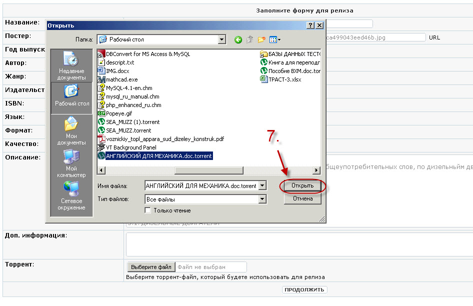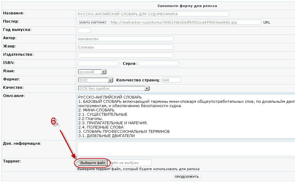 -6. Максимально заполняем все возможные поля и в конце выбираем наш созданный торрент файл с расширением *.torrent