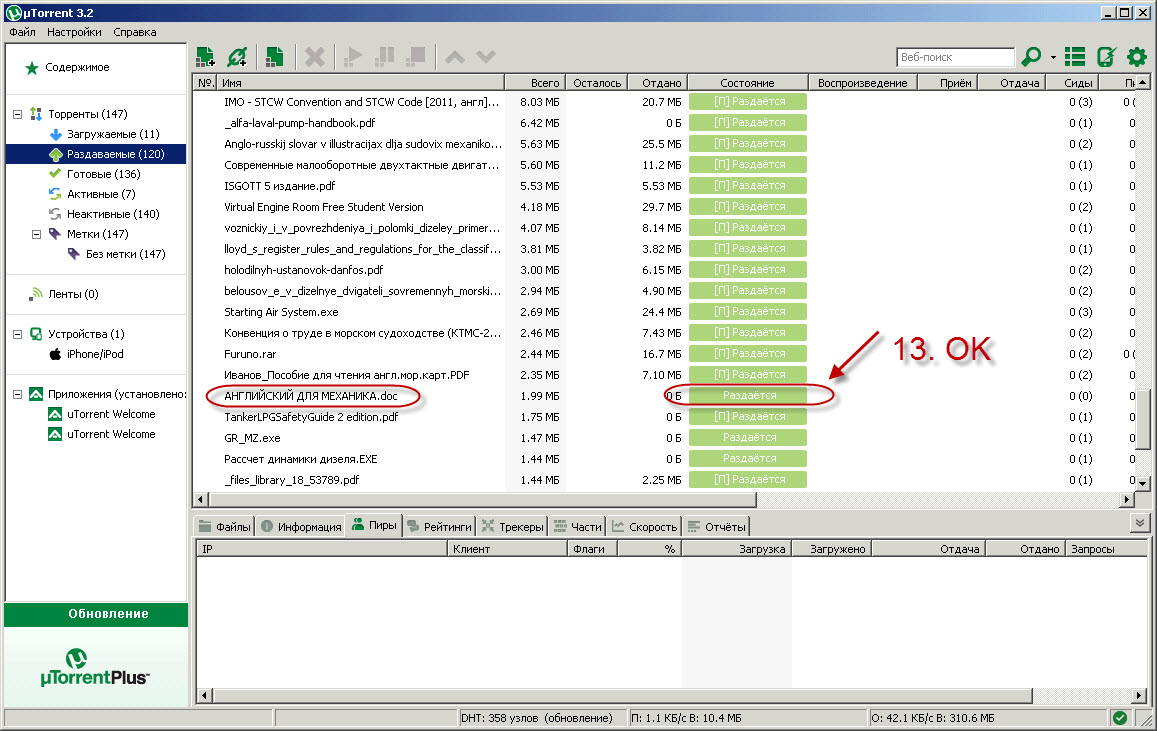 -13. Как только вы нажмете ОК, раздача примет статус ПРОВЕРЯЕТСЯ и по завершении проверки, статус изменится на РАЗДАЕТСЯ. Если в статусной строке написано ЗАГРУЖАЕТСЯ 0%, то значит вы накосячили где-то, либо файл битый