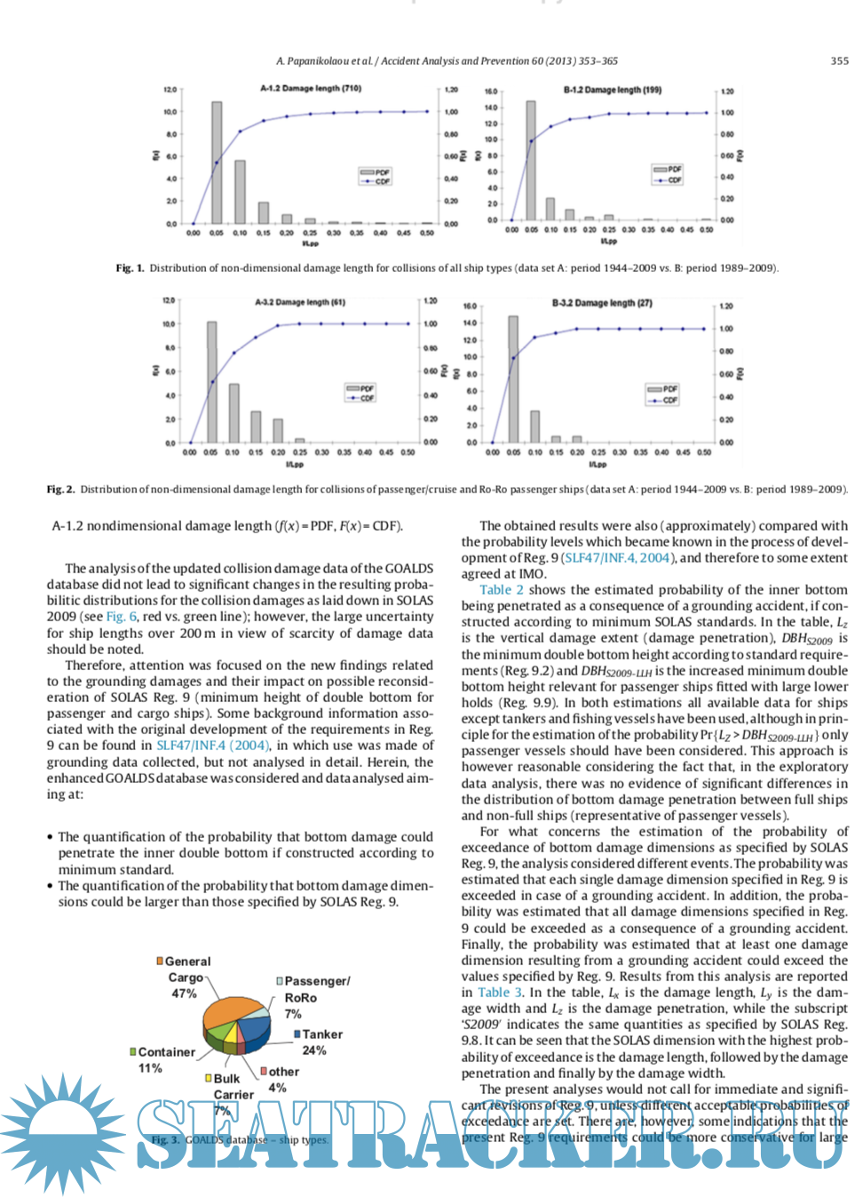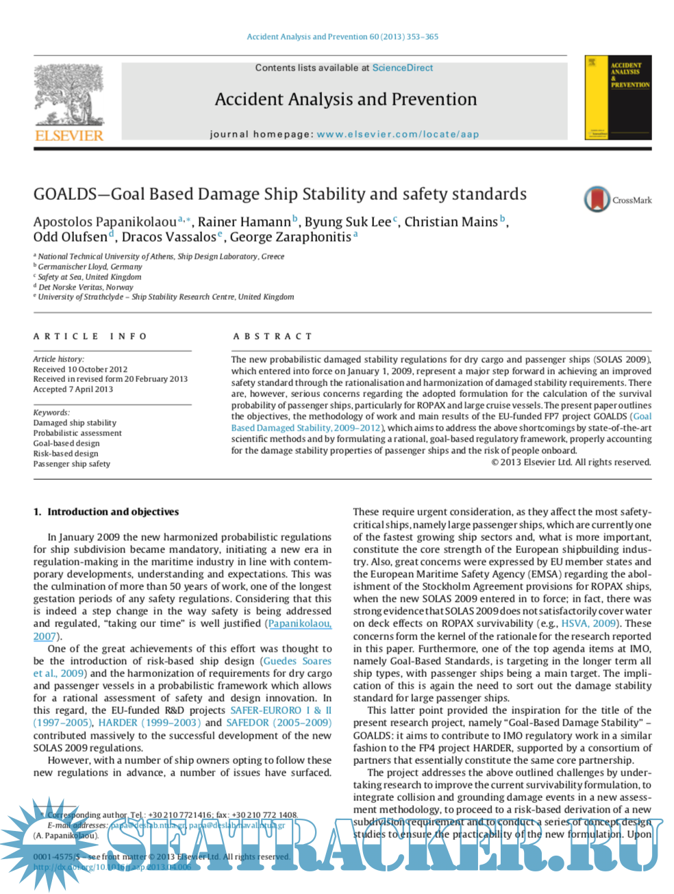 Description: The new probabilistic damaged stability regulations for dry cargo and passenger ships (SOLAS 2009), which entered into force on January 1, 2009, represent a major step forward in achieving an improved safety standard through the rationalisation and harmonization of damaged stability requirements. There are, however, serious concerns regarding the adopted formulation for the calculation of the survival probability of passenger ships, particularly for ROPAX and large cruise vessels. The present paper outlines the objectives, the methodology of work and main results of the EU-funded FP7 project GOALDS (Goal Based Damaged Stability, 2009–2012), which aims to address the above shortcomings by state-of-the-art scientific methods and by formulating a rational, goal-based regulatory framework, properly accounting for the damage stability properties of passenger ships and the risk of people onboard.