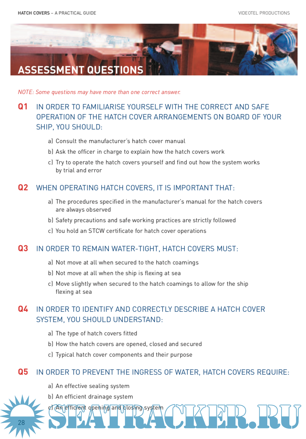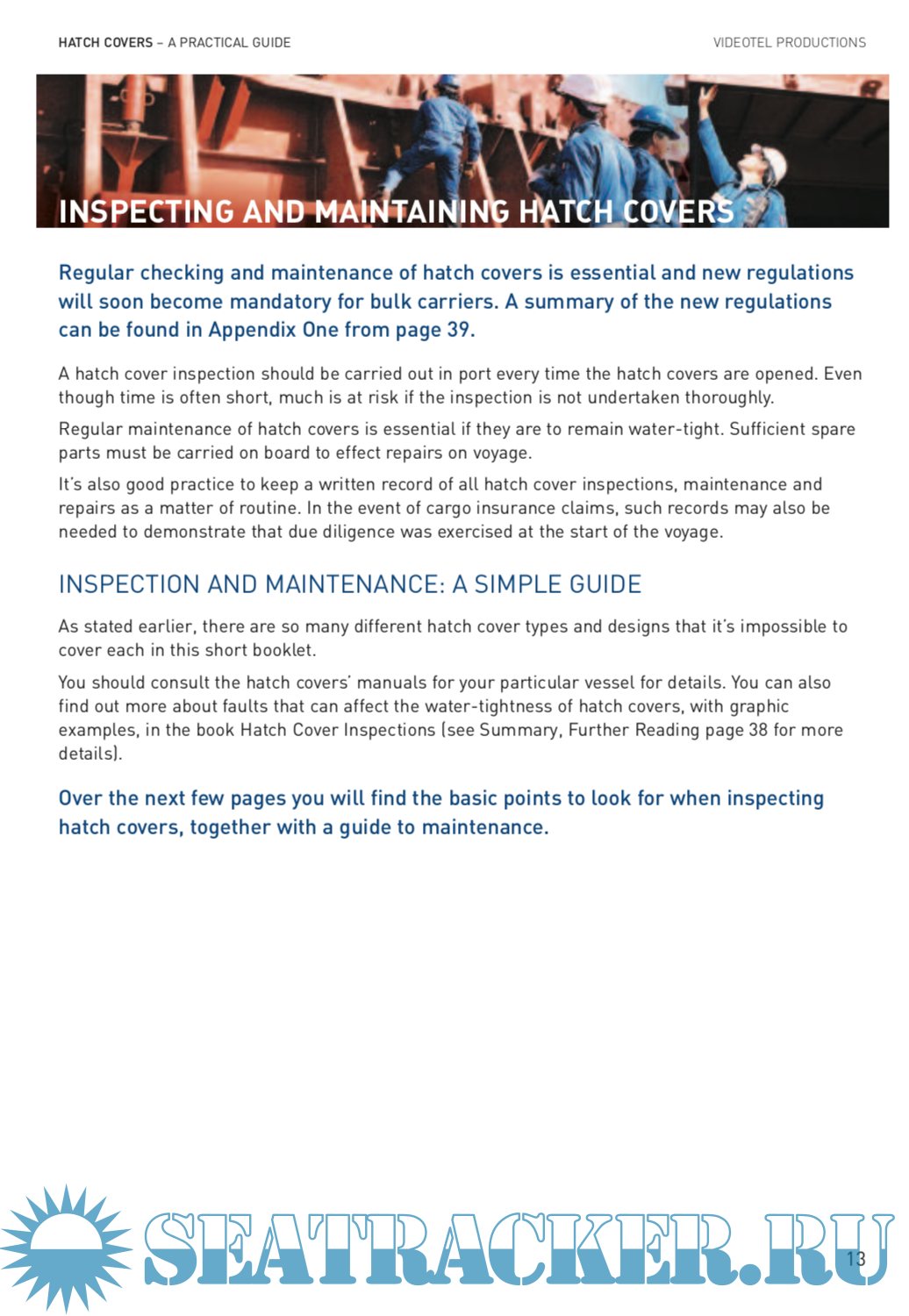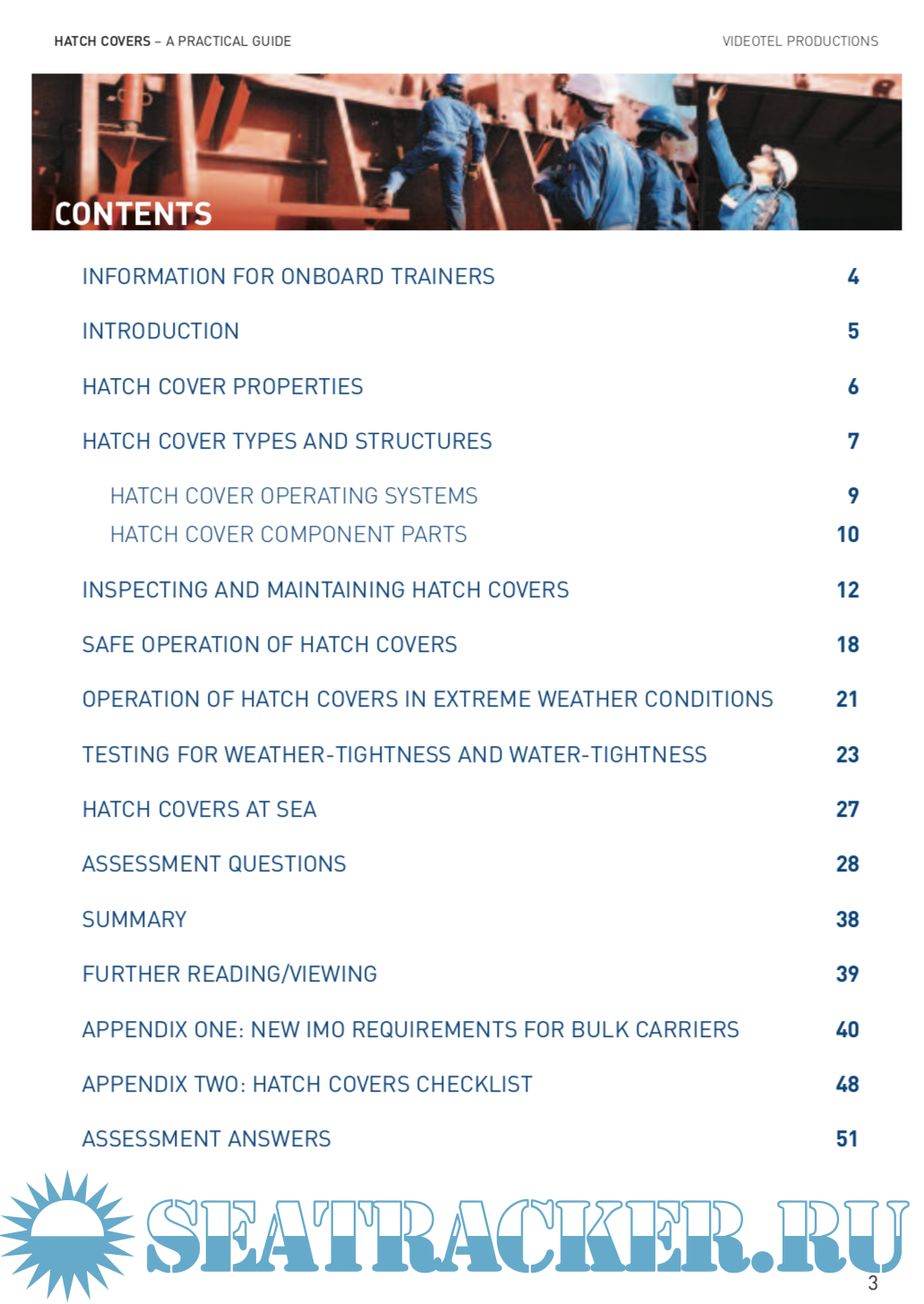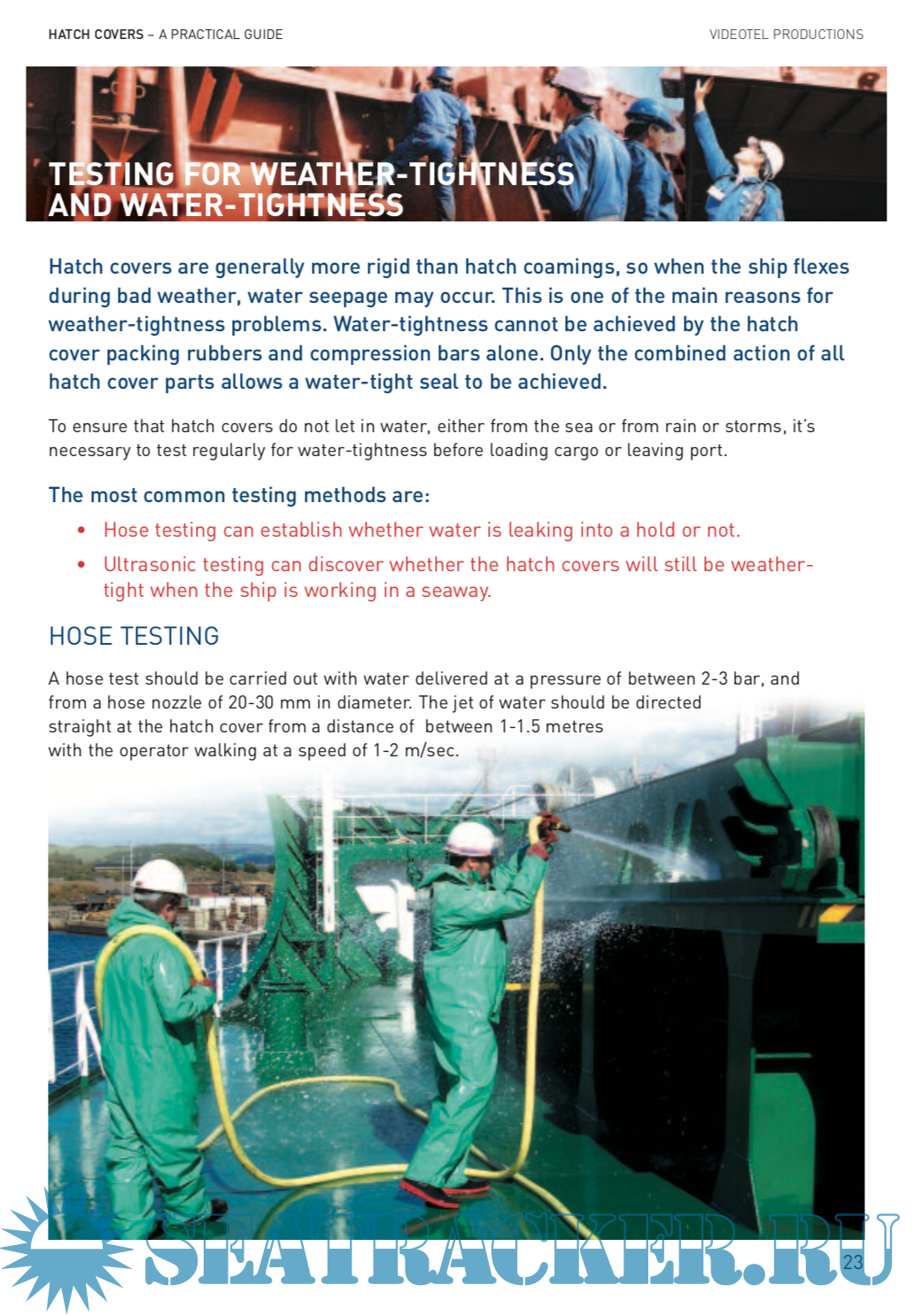 Description: The content of the booklet opens with two chapters dealing with the properties, type and structures of the hatch covers including operating systems and component parts. There the chapters come devoted to the inspection and maintenance of the hatch covers, their safe operation including operation in extreme weather such as hot and cold weather, high winds and heavy rains, methods of testing the hatch covers for water- and weather-tightness including hose testing an ultrasound testing, air and choke test, and hatch covers at sea issues like use of sealing tapes and high expansion foams.