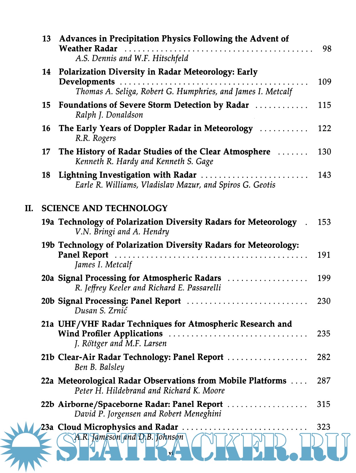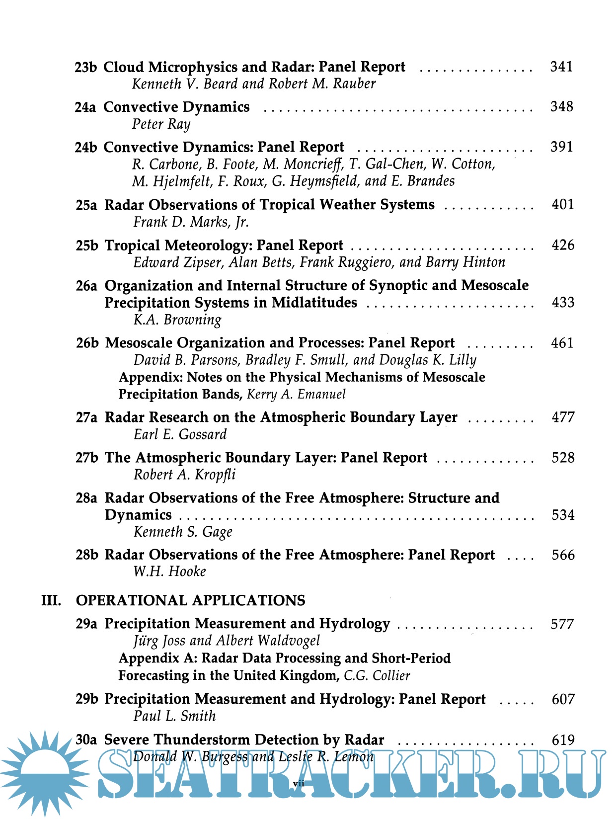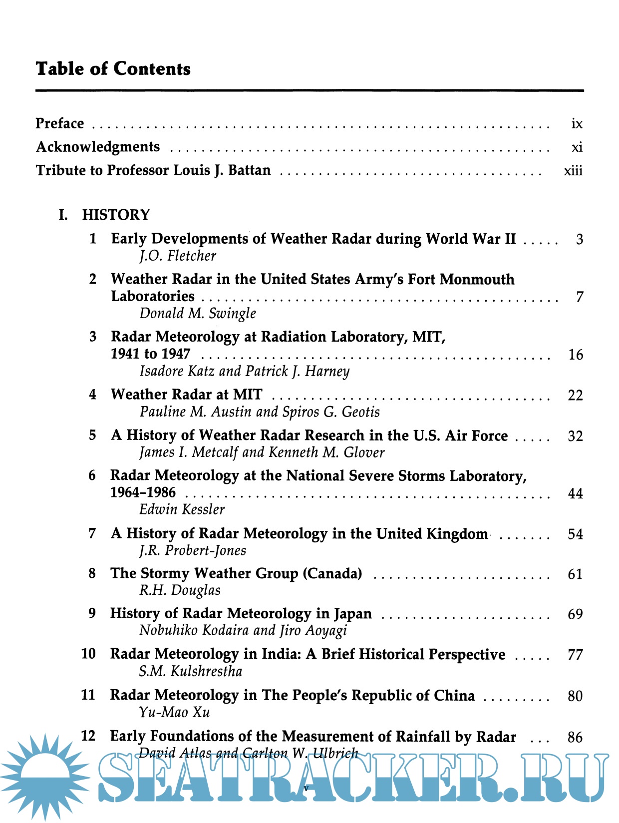Year: 1990 Language: english Author: Atlas D. (eds.) Genre: Research papers Publisher: American Meteorological Society ISBN: 978-1-935704-15-7 Format: PDF Quality: Scanned pages Pages count: 817 Description: This fully illustrated volume covers the history of radar meteorology, deals with the issues in the field from both the operational and the scientific viewpoint, and looks ahead to future issues and how they will affect the current atmosphere. With over 200 contributors, the volume is a product of the entire community and represents an unprecedented compendium of knowledge in the field.