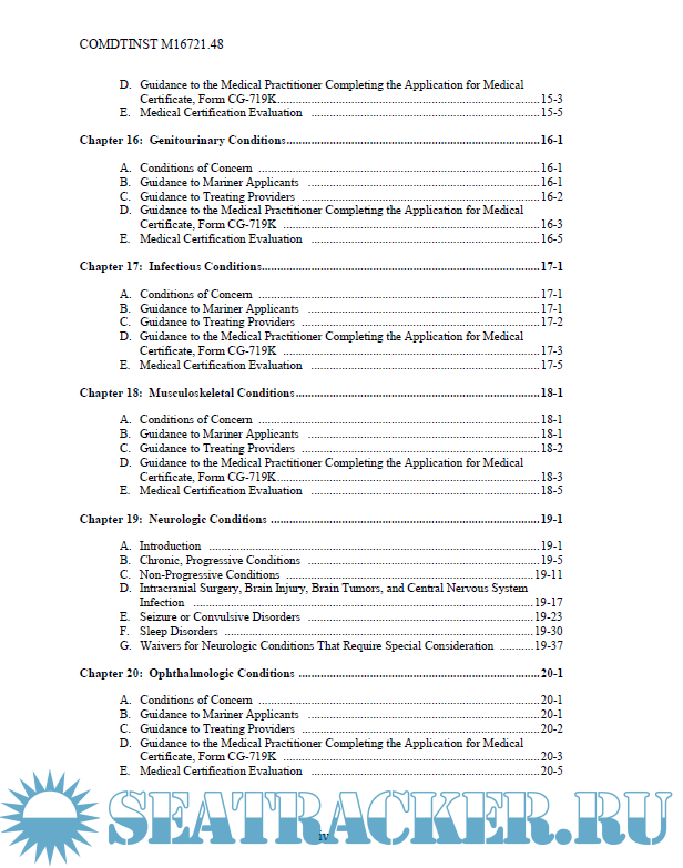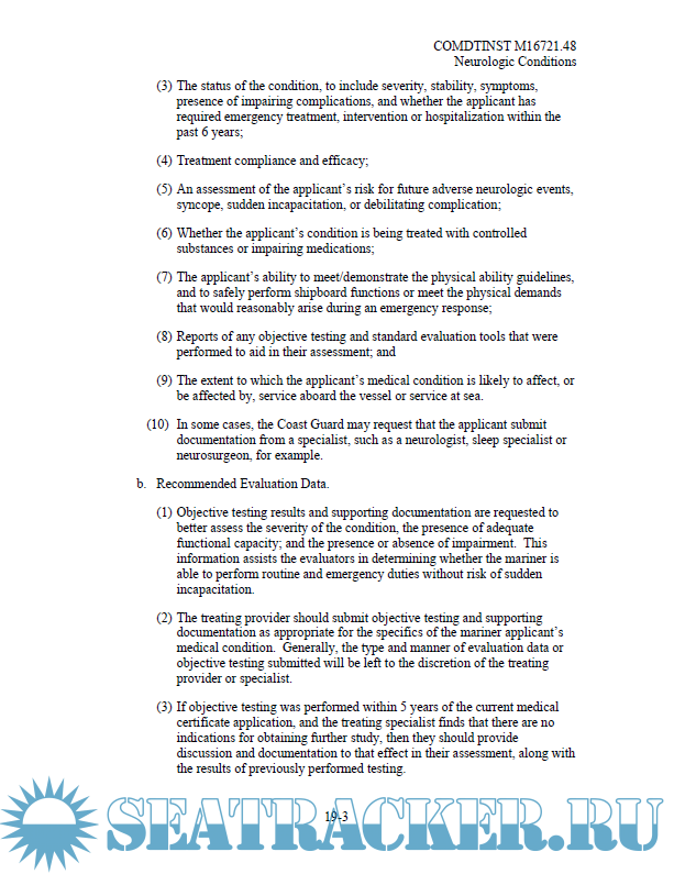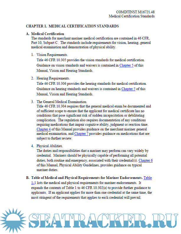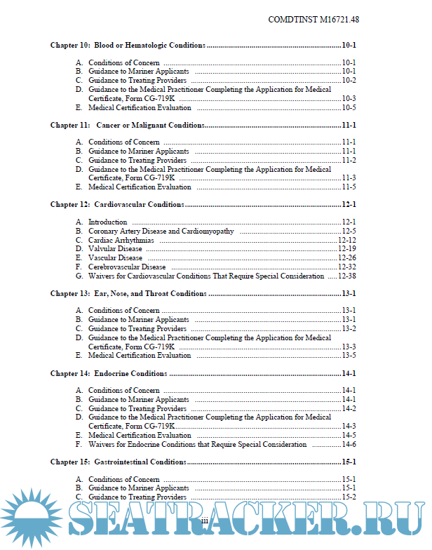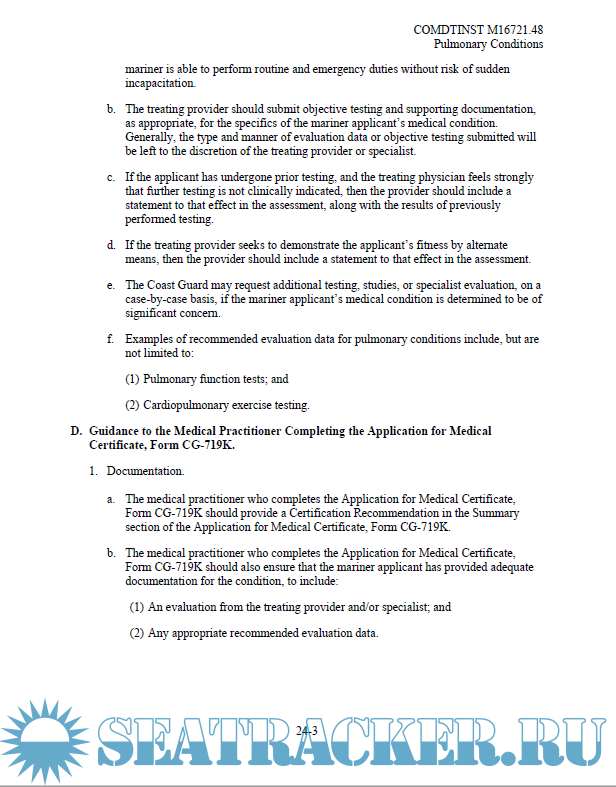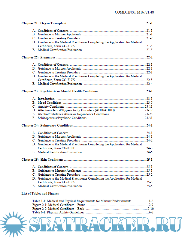 Description: This Manual provides guidance for evaluating the physical and medical condition of applicants for merchant mariner medical certificates. The guidance in this Manual should assist medical practitioners, the maritime industry, individual mariners, and U.S. Coast Guard (hereinafter, Coast Guard) personnel in evaluating an applicant’s physical and medical status to meet the requirements of References (a) through (d).