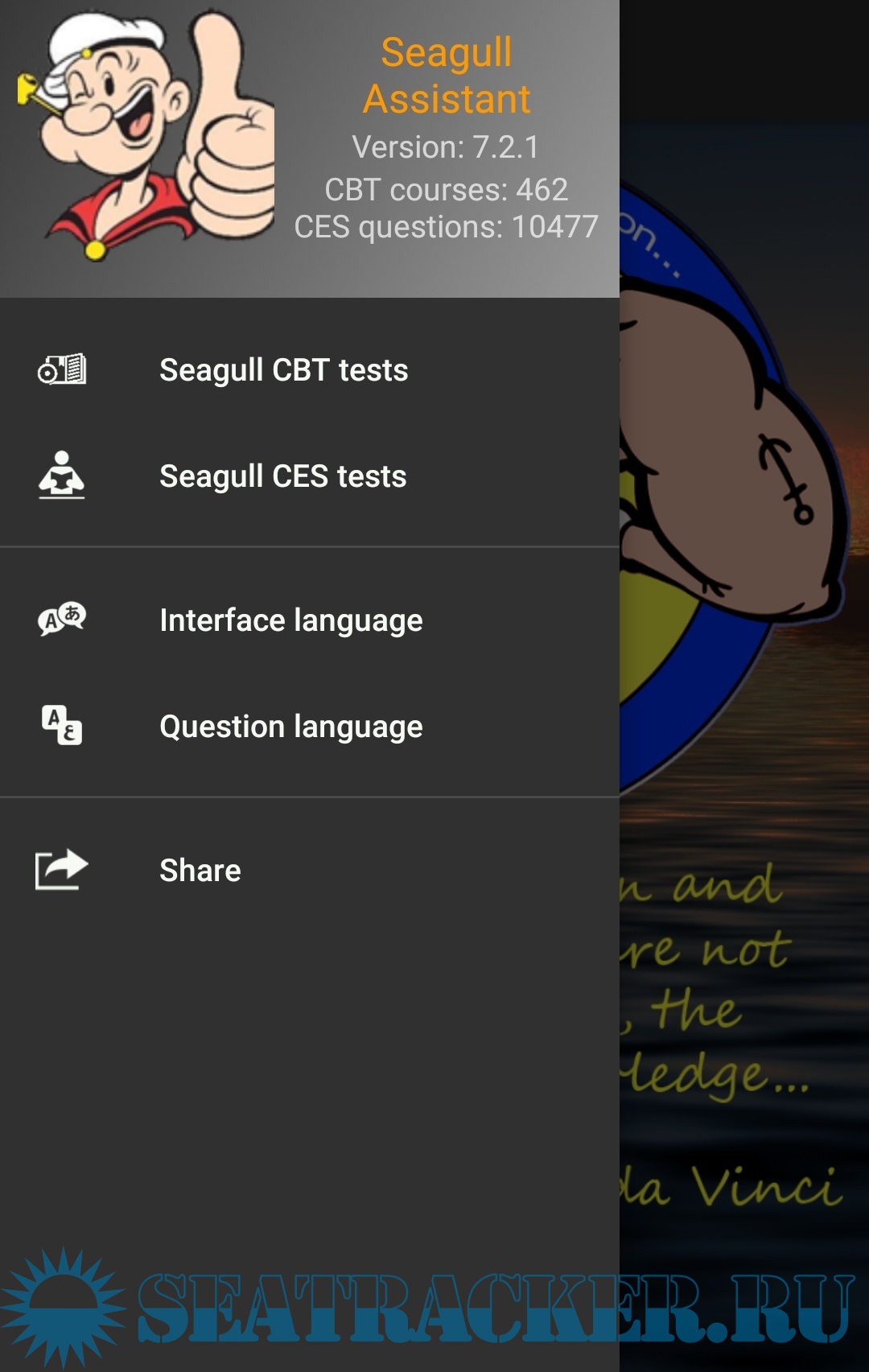 Приложение для телефона с ОС Андроид с ответами на новые морские тесты Seagull: CBT (Computer Based Training) и CES 5 (Crew Evaluation System). Будет полезна всем морякам. Удобный интерфейс и поиск по тексту.