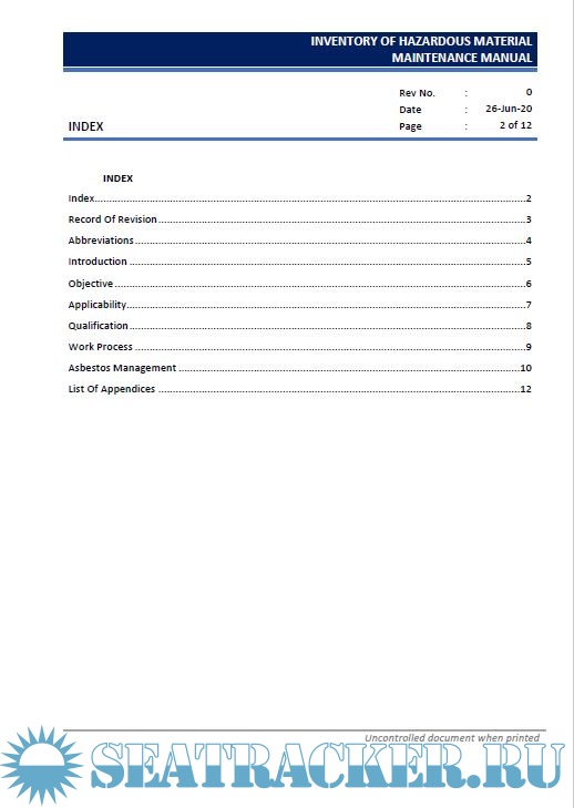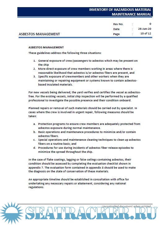 Year: 2020 Language: english Author: Synergy Group Genre: Manual Publisher: Synergy Group Format: PDF Quality: eBook Pages count: 12 Description: This “Management procedure to maintain the Part I of IHM” is established for the purpose of meeting Regulation 5.3 of the Convention and Par. 5.2.2 of the Guidelines by means of properly maintaining, during the ship’s operational stage, the part I of IHM developed according to the Convention and the Guidelines. It is aimed: 1. To fulfill the requirements of regulation 2. To establish reliable standards according to HKC and EU SRR requirements. (as applicable) 3. To standardize the entire process of updating of IHM in line with operation of the ship such as repair, maintenance and purchasing of equipment and components. 4. To ensure that responsibilities for IHM maintenance task is clearly defined. Additional info: Also contains: RESOLUTION MEPC.269(68)Adopted on 15 May 2015, 2015 Guidelines For The Development Of The Inventory Of Hazardous Materials & MSC/Circ.1045 Guidelines For Maintenance And Monitoring Of On-Board Materials Containing Asbestos.