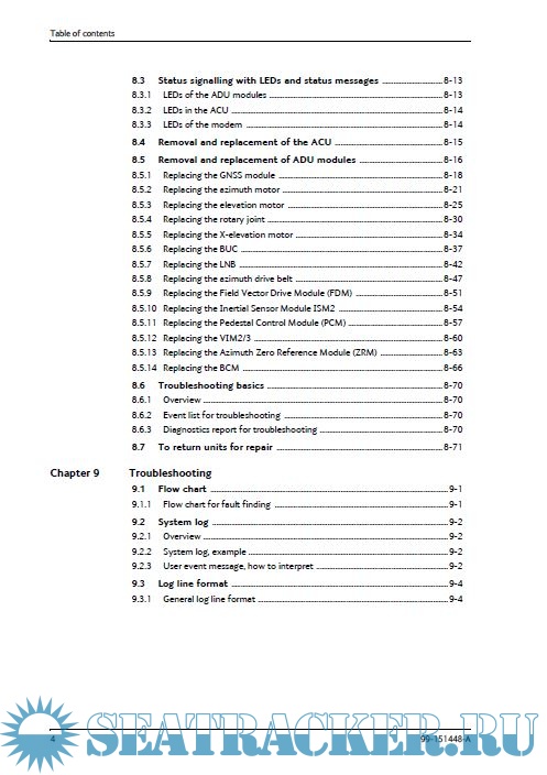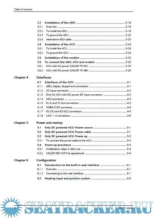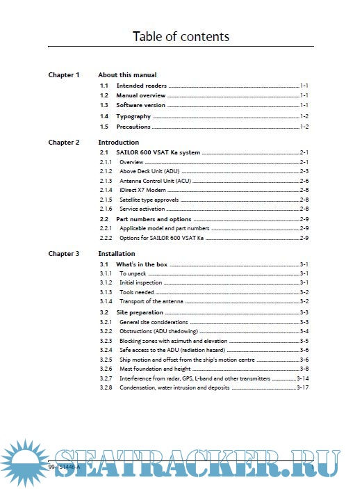 Year: 2018 Language: english Author: Thrane and Thrane Genre: Manual Publisher: Thrane and Thrane Edition: March Format: PDF Quality: eBook Pages count: 251 Description: This is an installation and service manual for the SAILOR 600 VSAT Ka system, intended for installers of the system and service personnel. Personnel installing or servicing the system must be properly trained and authorized by Cobham SATCOM. It is important that you observe all safety requirements listed in the beginning of this manual, and install the system according to the guidelines in this manual.