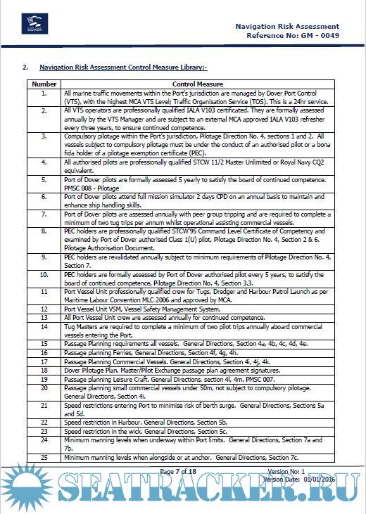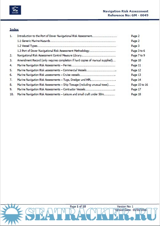 Description: The Port of Dover Navigational Risk Assessment document has been compiled to formally identify all the marine hazards both commercial and leisure within the jurisdiction of the Port. Further to this in order to support the Safety Management System (Port Marine Safety Code), a full assessment of the hazards has been carried out against a standard of acceptability. Where appropriate, risk reducing control measures have been put in place to eliminate or reduce the risk to as low as reasonably practicable (ALARP). In order to fully examine the hazards and risks, external stakeholders with specific skills and knowledge have been included in the process.