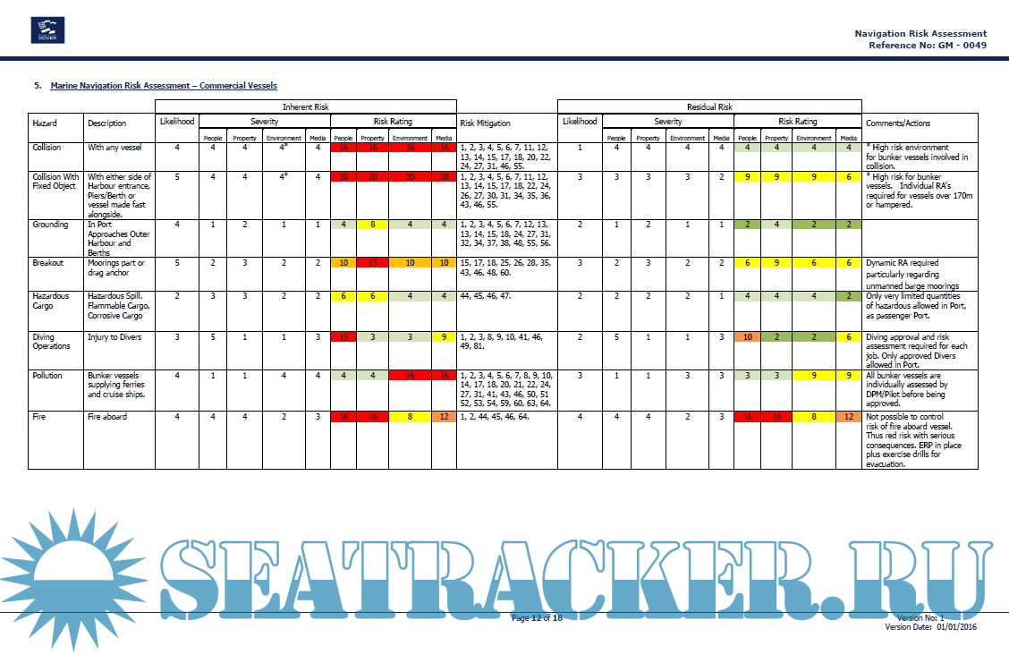 Year: 2016 Language: english Author: Nick Shearman Publisher: Port of Dover Edition: 1 Format: PDF Quality: eBook Pages count: 19 Description: The Port of Dover Navigational Risk Assessment document has been compiled to formally identify all the marine hazards both commercial and leisure within the jurisdiction of the Port. Further to this in order to support the Safety Management System (Port Marine Safety Code), a full assessment of the hazards has been carried out against a standard of acceptability. Where appropriate, risk reducing control measures have been put in place to eliminate or reduce the risk to as low as reasonably practicable (ALARP). In order to fully examine the hazards and risks, external stakeholders with specific skills and knowledge have been included in the process. As with any Safety Management System, we have a robust monitoring and review system in place within the Port Marine Safety Code to fully support the validity of the Navigation Risk Assessment document. For the purposes of this document the definition of “hazard” and “risk” are detailed below. “Hazard”: A potential source of harm, loss or injury. “Risk”: The probability of suffering harm or loss and is a measure of the frequency and consequence of a particular hazard.