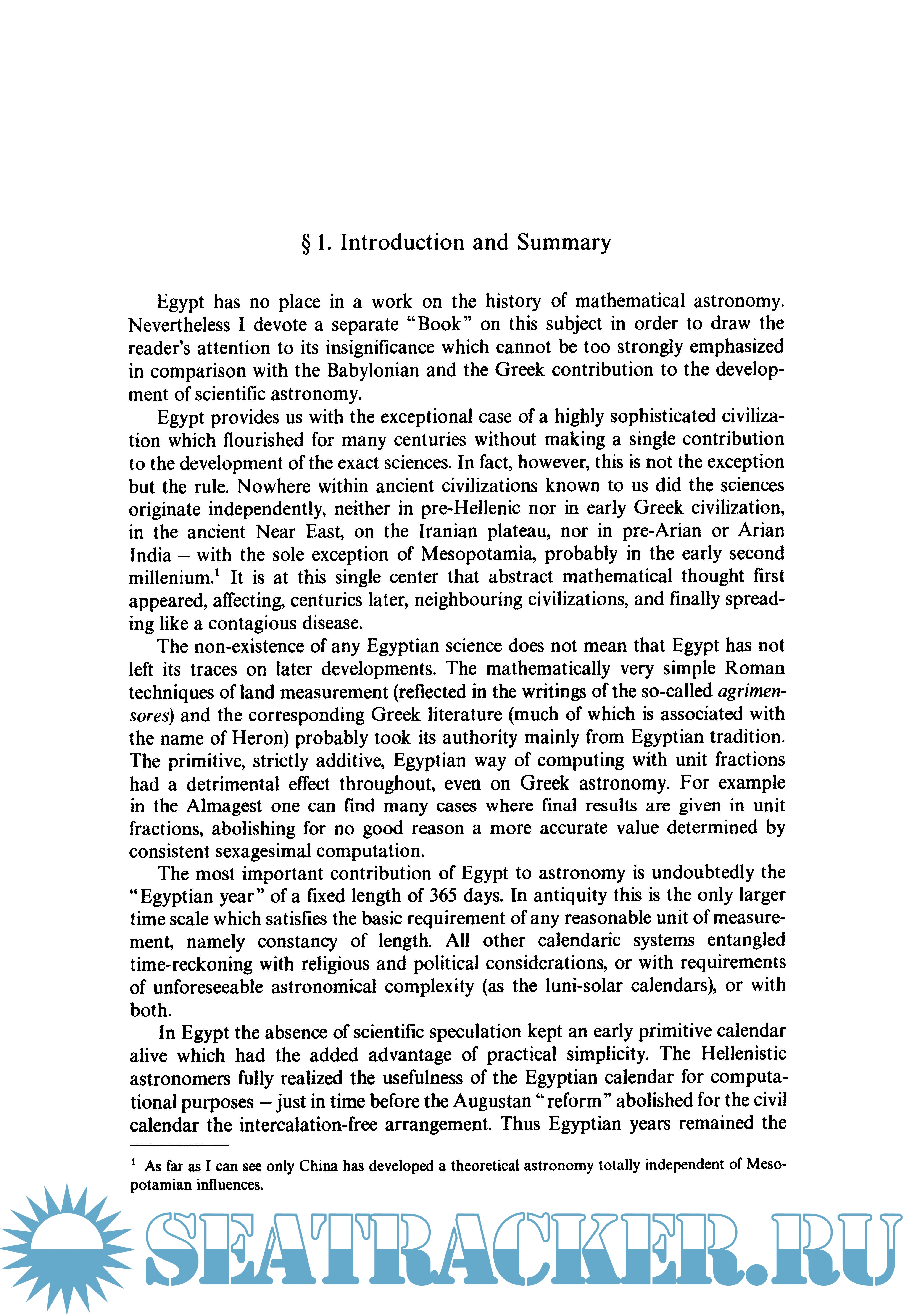 Year: 1975 Language: english Author: 0. Neugebauer Genre: Handbook Publisher: Springer ISBN: 978-3-642-61912-0 Format: PDF Quality: OCR without errors Pages count: 1468 Description: At once the most comprehensive and detailed history of ancient astronomy undertaken. From Meton of Athens in the fifth century B.C. and the unnamed scribes of Babylon, through Hipparchus and Ptolemy, to the shadowy figures of Olympiodorus and Stephanus in the early period of the Byzantine Empire, from primitive shadow tables and calendars of star phases, through Babylonian ephemerides and the Almagest, to the odd fragments preserved in late astrologers, the entire panorama of astronomy is set forth.