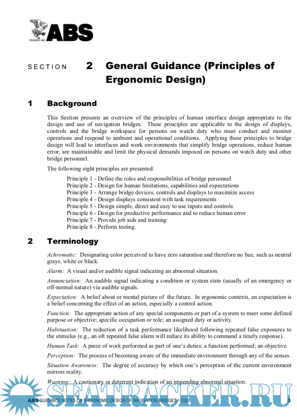 These Guidance Notes for the Ergonomic Design of Navigation Bridges provide vessel designers with the ergonomic principles and data appropriate to the design of navigation bridges; and in doing so serve to supplement and support the ABS Guide for Bridge Design and Navigational Equipment/Systems. Ergonomic design guidance herein applies only to navigation bridges and associated equipment.
