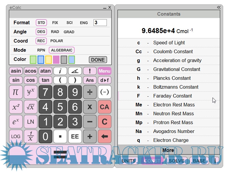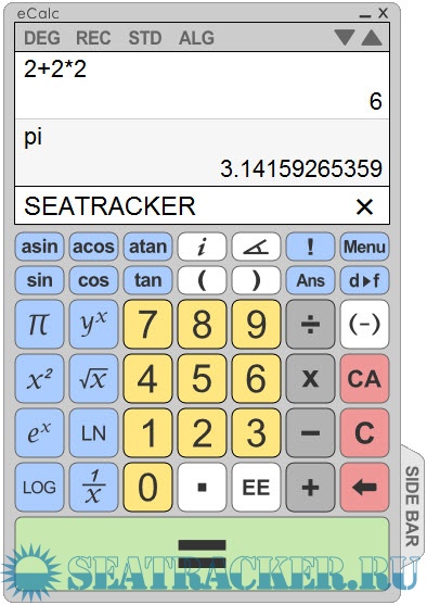 Year: 2009 Version: 1.5.1 Developer: eCalc Platform: Windows 64-bit OS compatibility: yes System Requirements: Windows 98/XP/7/10 Localization: english Crack: Registered version Description: Experience the full power of the eCalc Scientific Calculator on your Windows Desktop. In addition to all the powerful calculating features of eCalc you get the option of six color schemes and a sliding side palette which you can open and close to maximize your desktop space. eCalc Scientific is a very advanced scientific calculator that offers you all the functions to suit your mathematical needs, from the most simple to the most sophisticated, such as trigonometric, logarithmic, and angular functions, fractions, unit conversions, and more. It also includes math helping tools, such as a constant descriptor and an equation solver. eCalc Scientific Calculator's interface is well designed and completely self-explanatory. It has the same look and feel of a real scientific calculator. Its buttons are very clearly labeled, and are grouped by colors according to their functionality. The area representing the display is big, and it has been divided into two sections - one to show the current operands and symbols, and another for the previous operations and the results history. The buttons included in this main interface give you access to the most common functions, like sin, cosine, tangent, and their corresponding inverse functions; the four basic operations, PI constant, square and square root, logarithms, exponentials, factorial, parenthesis, and more. There is also a button to access the display's menu, where you can select your preferred Format mode (among STD, FIX, SCI, and ENG) and the number of decimals to be displayed, an Angle mode (among DEG, RAD and GRAD), a Coordinates mode (among REC and POLAR), and a Working mode, between RPN and ALGEBRAIC. Here you can also change the color of the program's interface. In the top side of the display there is a bar that allows you to change quickly among all the modes mentioned above, and a couple of buttons to scroll the display up and down. eCalc Scientific is an excellent calculator which provides you with a complete set of mathematical functions. Unfortunately, it frequently shows a "Register Now" reminder, followed by a short delay, until a link with the "I will register later" message appears - clicking on it will allow you to continue with your work. As an alternative, there is also an on-line version of the calculator that works without restrictions, though it obviously requires a working Internet connection. Additional info: Отличный калькулятор, который, в свое время, служил верой и правдой. Не думал, что станет проблемой найти его в сети, но я нашел