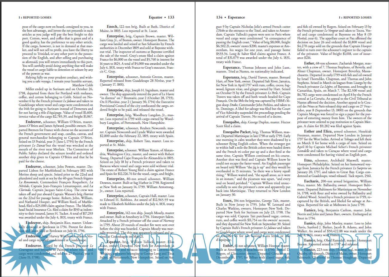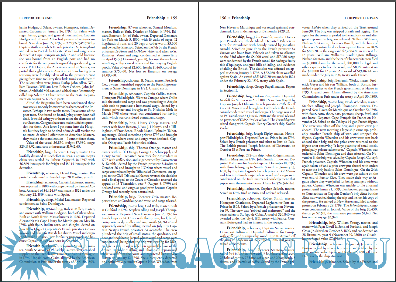 Description: During the French Revolutionary and Napoleonic eras, France was plagued by war and massive crop failures and was desperately in need of supplies. Both legally and illegally, French privateers and cruisers took cargo from merchant vessels of every flag engaged in foreign trade, and perhaps no country was as affected as the United States. While it is impossible to know the true number of vessels, their value, or the value of cargoes confiscated or destroyed, 6,479 claims involving more than 2,300 vessels were filed under the French Spoliation Act of 1885. Filed by the descendants of vessel and cargo owners, insurance agents, and anyone else who had a financial interest in a voyage or lost property to French land forces, these claims give the closest possible approximation of American goods lost to the French. Section I presents a comprehensive index of losses as reported to the State Department, while Section II presents court cases detailing important questions of American and international law which relate to the French assault on American shipping. Section III presents the disposition of claims filed by insurance companies, administrators, executors, receivers, and trustees in the federal Court of Claims under the French Spoliation Act. Also included are a glossary, a list of important geographical locations, and an overview of relevant acts of Congress, proclamations, treaties, and foreign decrees.