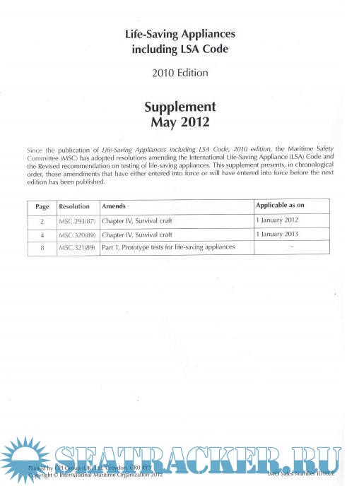 Additional info: Since the publication of LSA Code 2010 Edition, MSC has adopted resolutions amending the LSA Code and Revised recommendation on testing of life-saving appliances. The supplement presents, in chronological order, those amendments that either entered into force or will have entered into force before the next edition has been published.