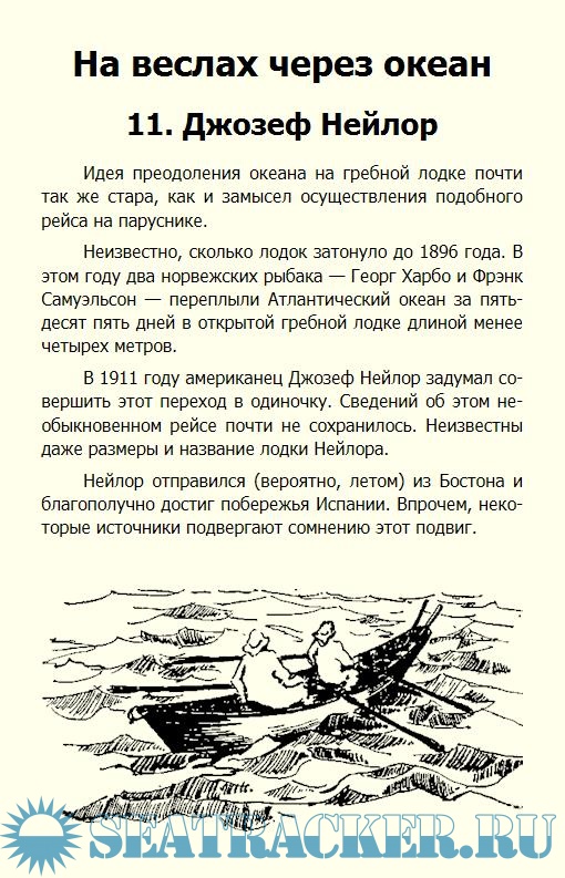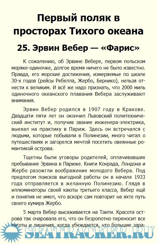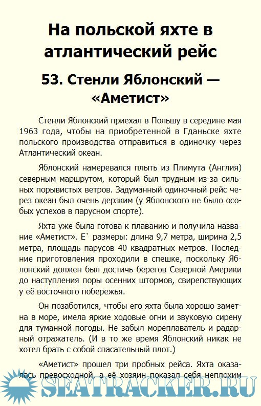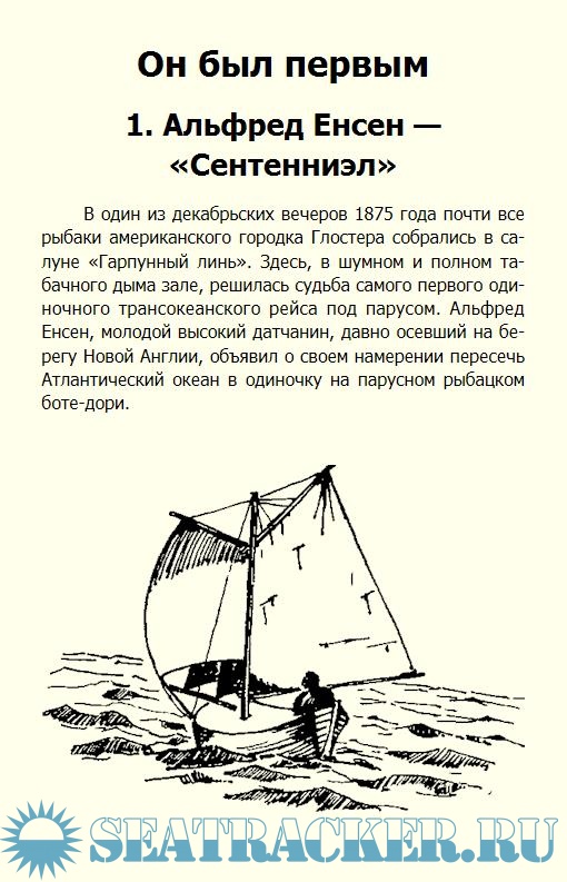 Анджей Урбанчик В ОДИНОЧКУ ЧЕРЕЗ ОКЕАН. Сто лет одиночного мореплавания Отважное племя морских робинзонов Он был первым 1. Альфред Енсен — «Сентенниэл» Пять с половиной месяцев на просторах тихого океана 2. Бернард Джилбой — «Пасифик» Первое состязание 3. Джошиа Лоулор — «Морской змей» 4. Уильям Эндрюс — «Сирена» Уильям Эндрюс не сдается! 5. Уильям Эндрюс — «Саполио» Полузабытый мореплаватель 6. Рудольф Фрич — «Нина» Первый кругосветный рейс 7. Джошуа Слонам — «Спрей» Подвиг беспалого моряка 8. Говард Блэкберн — «Грейт Вестерн» Гонки без соперников 9. Говард Блэкберн — «Грейт Рипаблик» Десятый одиночный мореплаватель 10. Людвиг Эйзенбрам — «Колумбия II» На веслах через океан 11. Джозеф Нейлор Четыре попытки 12. Томми Дрейк — «Сэр Фрэнсис», «Сэр Фрэнсис II», «Пилигрим», «Прогресс» Второй кругосветный рейс 13. Гарри Пиджен — «Островитянин» В погоне за солнцем 14. Ален Жербо — «Файеркрест» К огненной земле 15. Гюнтер Плюшов — «Огненная Земля» На байдарке через океан 16. Франц Ромер — «Немецкий спорт» Без подготовки 17. Пауль Мюллер — «Ага» Вокруг земли наперекор ветрам 18. Эдвард Майлз — «Стради», «Стради II» Первая попытка 19. Вито Дюма — «Лег» Необыкновенное путешествие 20. Фред Ребелл (Пауль Спроге) — «Элейн» Последний рейс 21. Ален Жербо — «Ален Жербо» «Островитянин» снова отправляется В кругосветное плавание 22. Гарри Пиджен — «Островитянин» Первый победитель мыса горн 23. Альфон Моллер Хансен — «Мэри Джейн» Северный путь Грэхема 24. Роберт Д. Грэхем — «Эмануэль» Первый поляк в просторах Тихого океана 25. Эрвин Вебер — «Фарис» Вокруг Земли в рекордное время 26. Луи Бернико — «Анаит» Ради спортивной славы 27. Людвиг Шлимбах — «Стортебеккер III» Через «ревущие сороковые» 28. Вито Дюма — «Лег II» Третье путешествие Дюма 29. Вито Дюма — «Лег II» Отчаянное путешествие 30. Джон Колдуэлл — «Язычник» С помощью двух двигателей и паруса 31. В. Мэрнан — «Семь морей II» На запад, через Красное море 32. Альфред Петерсен — «Сторновэй» К сожалению, не двукратно 33. Эдвард Олкард — «Искусительница» Вокруг света через 540 портов 34. Марсель Бардьо — «Катр ван» Несколькими фразами 35. Клайд Дил — «Рам» Девятнадцать тысяч миль плавания в одиночку 36. Жак-Ив Ле Тумелен — «Курун» Одна в Атлантическом океане 37. Энн Дэвисон — «Фелисити Энн» За бортом по своей воле 38. Ален Бомбар — «Еретик» Бог троицу любит 39. Жан Го — «Атом» Через океан с кошкой и попугаем на борту 40. Уильям Уиллис — «Семь сестричек» Четвертая экспедиция Вито Дюма 41. Вито Дюма — "Сирио" На самой маленькой яхте вокруг земного шара 42. Джон Газуэлл — "Трекка" На челне через Атлантику 43. Ханнес Линдеман — "Либерия II" Второй необычный рейс Линдемана 44. Ханнес Линдеман — "Либерия III" Польский летчик плывет под парусами через Атлантику 45. Кшиштоф Грабовский — "Тетис" Атлантический рейс на плоту 46. Рене Лекомб — "Пот-о-нуар" Первые атлантические гонки яхтсменов-одиночек 47. Фрэнсис Чичестер — "Джипси-Мот III" Блонди Хазлер — "Джестер", Дэвид Льюис — "Кардинал верту" Отважным везет 48. Кеничи Хори — "Сирена" Жан Го снова отправляется в кругосветный рейс 49. Жан Го — "Атом" Новый рекорд 50, Фрэнсис Чичестер — "Джипси-Мот III" Подвиг, достойный великих мореплавателей 51. Билл Нанс — "Кардинал верту" Последний рейс Лекомба 52. Рене Лекомб — "1000 вех" На польской яхте в атлантический рейс 53. Стенли Яблонский — "Аметист" Патриарх океана 54. Уильям 