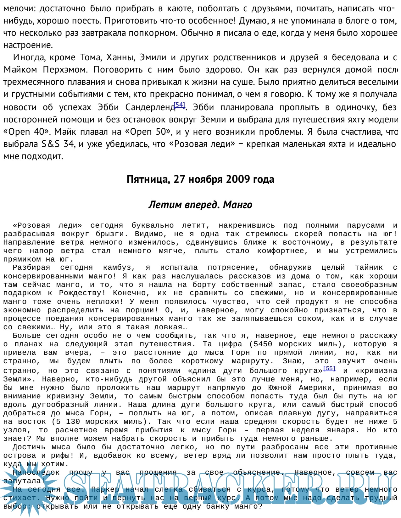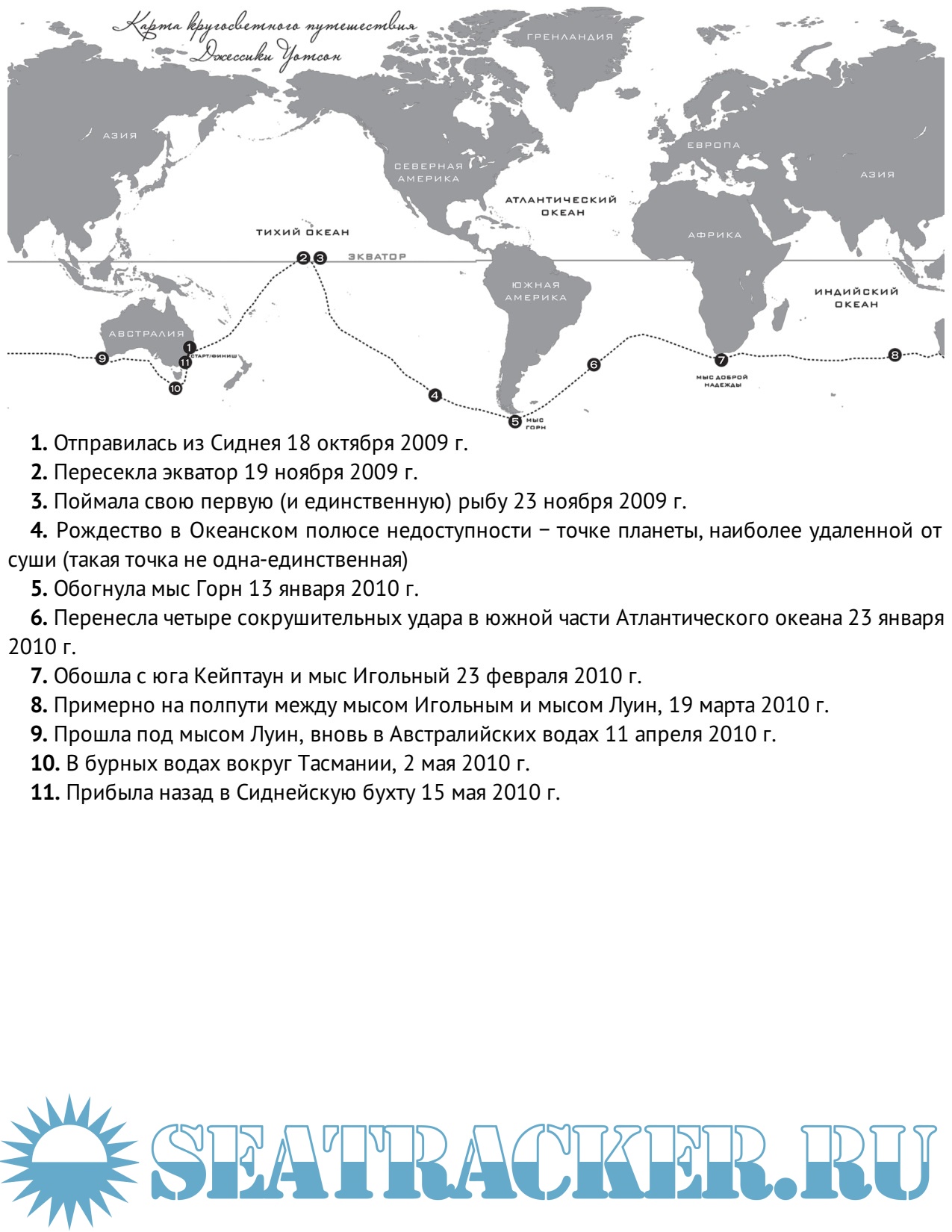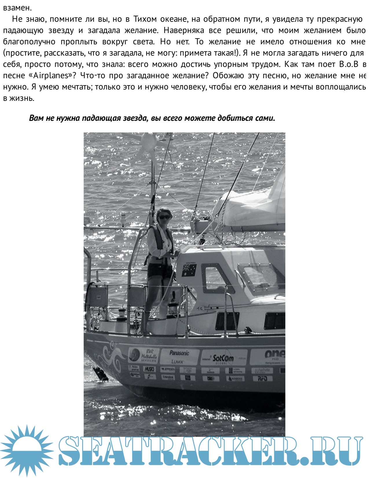 От автора Предисловие Часть первая Старт Этап первый: выход из Сиднея и путь на север, к островам Лайн Этап второй: на юг, к Чили и мысу Горн Этап третий: от мыса Горн – на Север Этап четвертый: по южной части Атлантического океана к Африканскому континенту Этап пятый: вокруг Южной Африки Этап шестой: из Южного океана по направлению к дому Часть вторая Путешествие Этап первый из Сиднея на север, к островам Лайн Понедельник, 19 октября 2009 года Исходный рубеж пройден Понедельник, 19 октября 2009 года, чуть позднее Голубое и розовое Вторник, 20 октября 2009 года Мы плывем! Четверг, 22 октября 2009 года Выход в Тасманово море и сон Пятница, 23 октября 2009 года Ме-е-едленно… Суббота, 24 октября 2009 года Об идеальной погоде и немного о еде Воскресенье, 25 октября 2009 года О прошедшей неделе и моей сухопутной команде Понедельник, 26 октября 2009 года Кальмар на палубе Вторник, 27 октября 2009 года Минуя Норфолк-Айленд Четверг, 29 октября 2009 года Ночь. Мои маленькие привычки. Вперед, к экватору Суббота, 31 октября 2009 года Мчусь во весь дух. О настроении Воскресенье, 1 ноября 2009 года Новая сумка провизии, новая карта и последний апельсин Понедельник, 2 ноября 2009 года Дела идут отлично. День, полный хлопот Вторник, 3 ноября 2009 года День, когда мы продвигались медленно. Общение и веб-сайт Среда, 4 ноября 2009 года Отдых и чтение Четверг, 5 ноября 2009 года Мокрая, бодрая и поедающая кексы! Суббота, 7 ноября 2009 года Пассат дует в паруса Воскресенье, 8 ноября 2009 года Поздновато взялась за блог! Понедельник, 9 ноября 2009 года Хлопотный день и …вода Среда, 10 ноября 2009 года Медленно, но верно приближаемся к экватору! Среда, 11 ноября 2009 года Обед украли! Пятница, 13 ноября 2009 года Плывем под шквалистым ветром Суббота, 14 ноября 2009 года Рыба, первая помощь, Паркер и хлеб Понедельник, 16 ноября 2009 года То быстро, то медленно. А рядом – дельфины Вторник, 17 ноября 2009 года Тридцать дней в море. Моя приятельница Среда, 18 ноября 2009 года Метеорит. Завтра пересекаем экватор! Четверг, 19 ноября 2009 года Великий день Пятница, 20 ноября 2009 года Северное полушарие Воскресенье, 22 ноября 2009 года Огибаем остров Рождества Понедельник, 23 ноября 2009 года Наконец-то я поймала рыбу! Этап второй: на юг, к Чили и мысу Горн Вторник, 24 ноября 2009 года Снова на юг Среда, 25 ноября 2009 года Стиральная машина Пятница, 27 ноября 2009 года Летим вперед. Манго Суббота, 28 ноября 2009 года Еще один день Понедельник, 30 ноября 2009 года Ветер снова набирает силу Вторник, 1 декабря 2009 года Похолодало. О мусоре и новой сумке с продуктами Четверг, 2 декабря 2009 года Кратко Суббота, 5 декабря 2009 года Лучше пока не стало! Воскресенье, 6 декабря 2009 года Тихое воскресенье Среда, 9 декабря 2009 года Готова к ветру! Пятница, 11 декабря 2009 года Банановое печенье. Смотрю, как мир проносится мимо Воскресенье, 13 декабря 2009 года К счастью, я не одинока! Понедельник, 14 декабря 2009 года Удивительный закат Четверг, 17 декабря 2009 года Лезу на мачту. Вхожу в Ревущие сороковые Пятница, 18 декабря 2009 года Новости вкратце Понедельник, 21 декабря 2009 года Серо и туманно Вторник, 22 декабря 2009 года Кругом туман Четверг, 24 декабря 2009 года Рождество на краю света! Пятница, 25 декабря 2009 года Счастливого Рождества! Суббота, 26 декабря 2009 года Неистовые пятидесятые Воскресенье, 27 декабря 2009 года Не такие уж и Неистовые пятидесятые! Вторник, 29 декабря 2009 года Ветер усилился Четверг, 31 декабря 2009 года Первый большо
