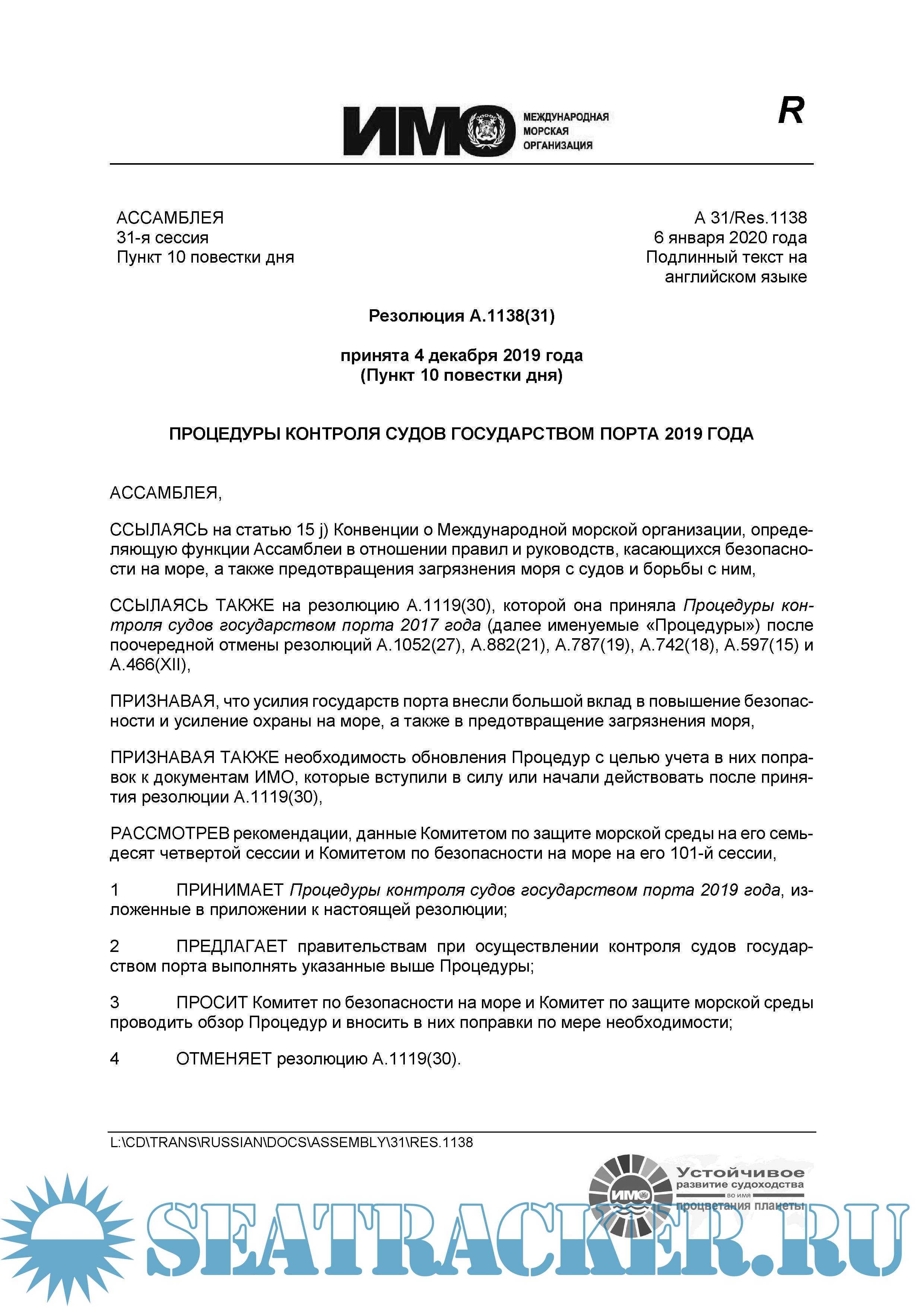 Приводится на русском языке текст резолюции А.1138(31) Международной морской организации (ИМО) — «Процедуры контроля судов государством порта 2019 года», принятой на 31-й сессии Ассамблеи ИМО (27 ноября — 6 декабря 2019 г.)