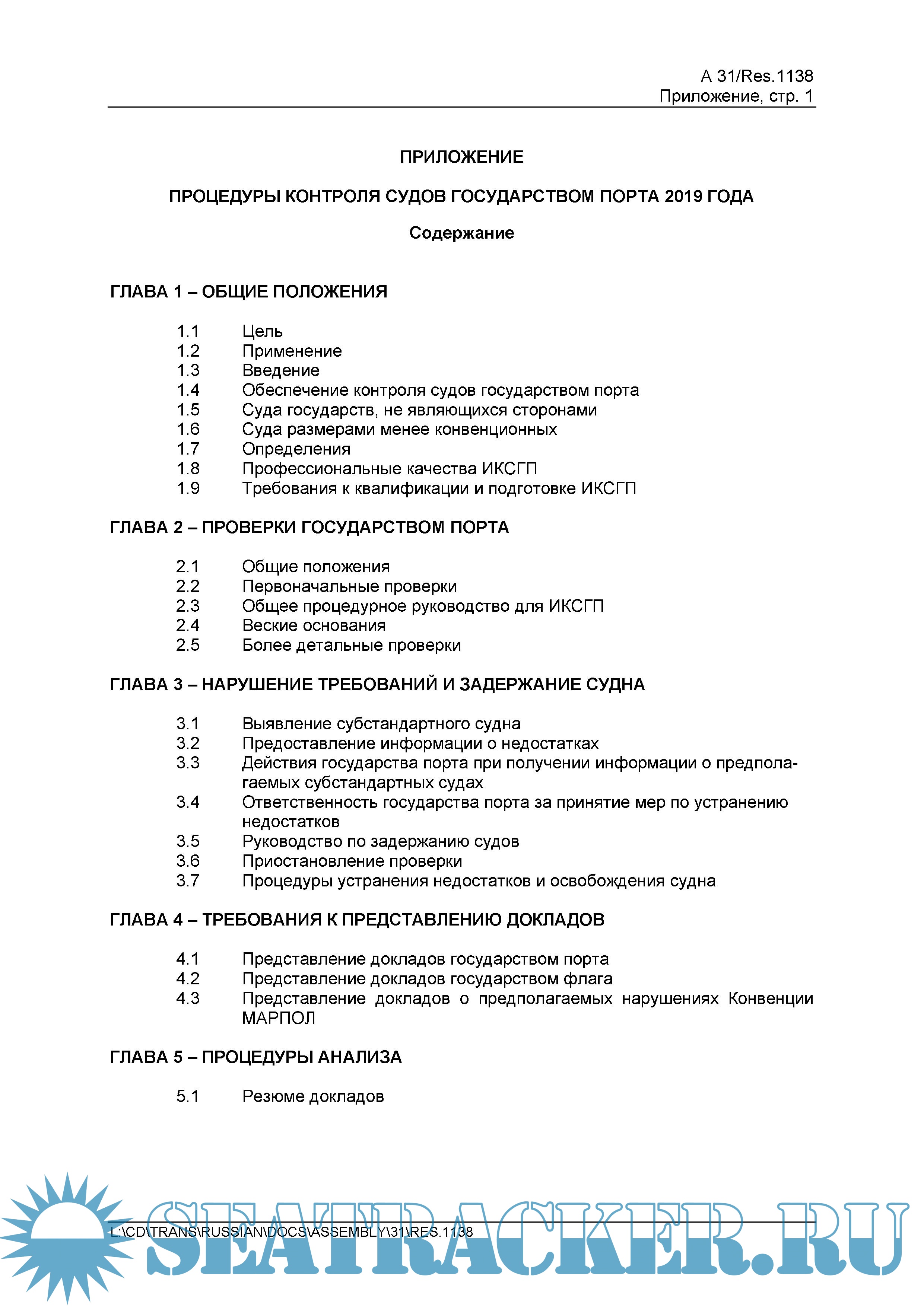 Документ предназначен предоставить основы руководства по проведению контроля судов государством порта и обеспечению единообразия в проведении этих проверок, по выявлению несоответствий судна, его оборудования или его экипажа и в применении процедур контроля.