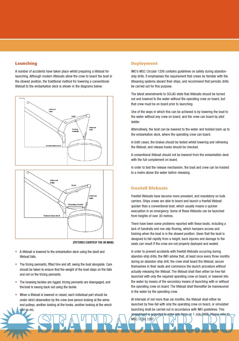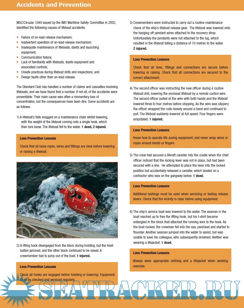 Year: 2007 Language: english Author: The Standard P&I Genre: Other Format: PDF Quality: OCR without errors Pages count: 8 Description: Lifeboats Are Meant To SAVE Lives In recent years, there have been a number of accidents during routine lifeboat drills, despite updated training and new designs of hooks, boats and davits. Part of the problem is the number of designs of hooks and lifeboats in service, estimated at more than 70, and it is essential that the crew are familiar with and capable of operating the equipment fitted on their ship.