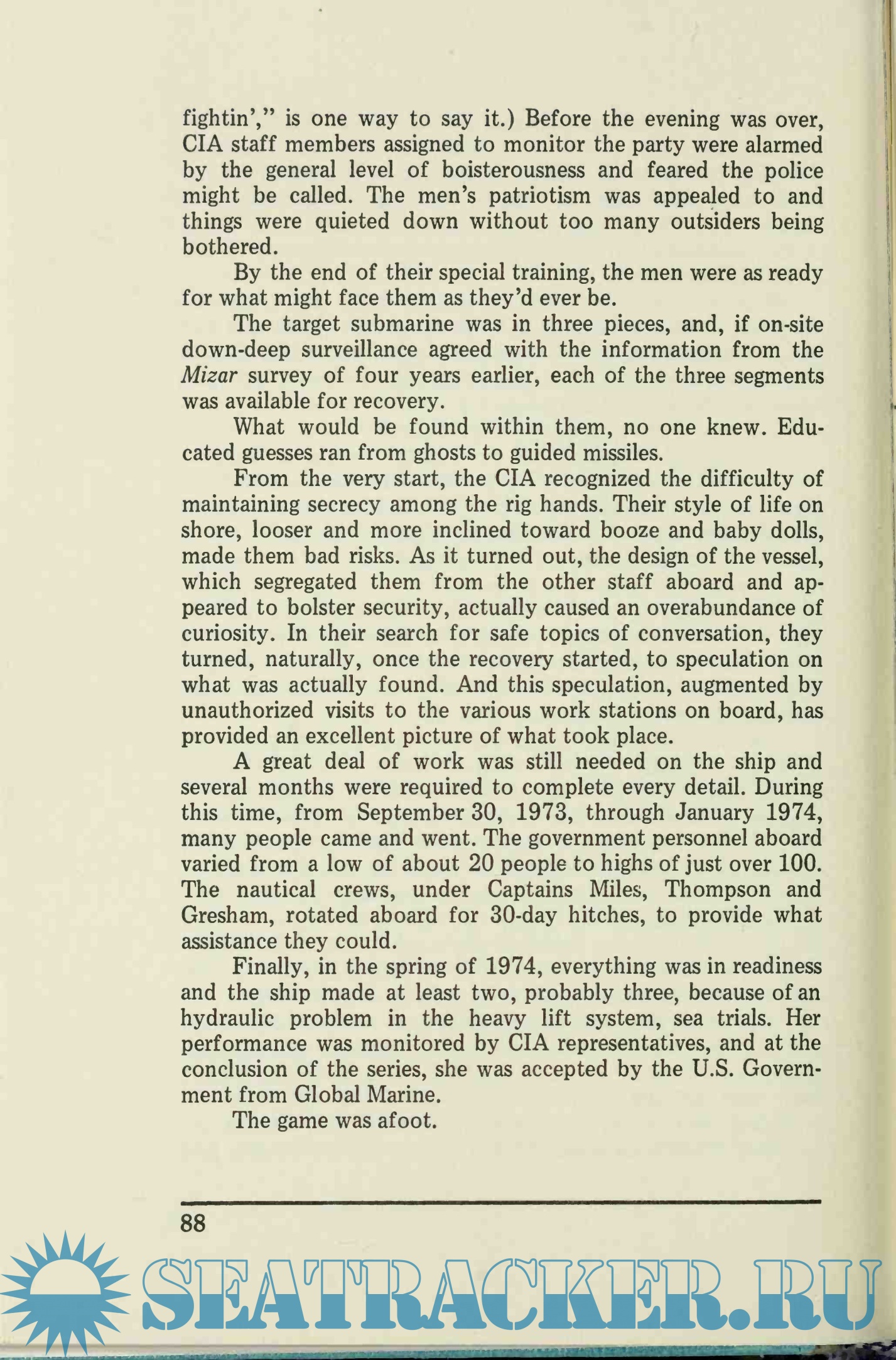 The Project was a monumental effort to create a tool that could reach three miles below the ocean's surface and pull the sub from primordial muck—in secret. Financed and built by Hughes and Global Marine under contract with the CIA, the ship created to pluck the sub from the ooze was a technological marvel. Two football fields in length and twenty-three stories high, the Hughes Glomar Explorer held in its hull a six-million-pound submersible "claw" for picking up sections of the submarine.