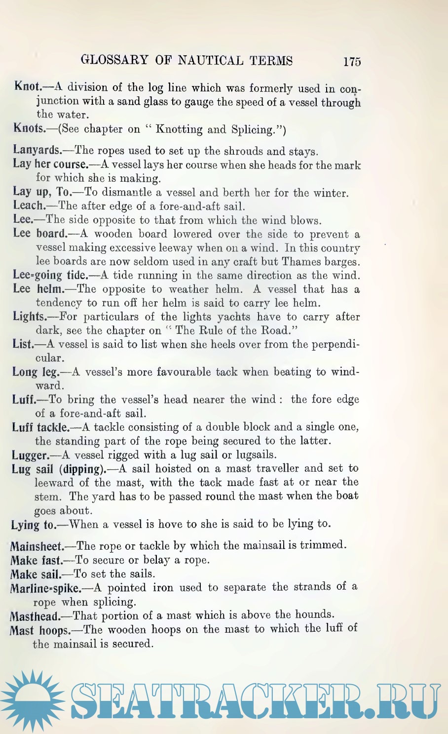 Description: This book was written in an era of transition from large yachts, that needed professional crews to small yachts, usually sailed by the owner and his family, without paid hands. The idea is that anyone who acquires a knowledge of the general principles of seamanship can, with a little practice, soon learn to sail a small yacht with confidence. The aim of the book is to explain the theory of seamanship and its practical application in simple language that should be intelligible to the beginner. A full glossary of nautical terms has been added for convenience, as well as diagrams of knots and hitches, to explain the basis of the marline-spike seamanship.