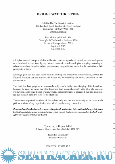 Year: 2013 Language: english Author: Nautical Institute Publisher: Nautical Institute Edition: 2013 Format: PDF Quality: Scanned pages Pages count: 181 Description: A practical self-study guide used by different companies for training bridge watchkeepers. It will help understanding of the reasons for checking, monitoring, recording and controlling. It covers all aspects of bridge work from testing the gear prior to sailing to error management and record keeping. Includes: watchkeeping in pilotage waters and in coastal waters; making a landfall; watchkeeping in reduced visibility; taking over the watch; emergencies; collision avoidance; automated bridges.