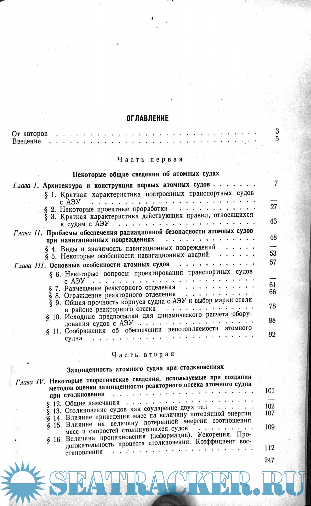 Приводятся данные о видах навигационных и других повреждения и налагаются причины, заставляющие уделять особое внимание обеспечению безопасности судна с АЭУ при столкновениях. Анализируются результаты экспериментальных исследования процесса столкновения судов и эффективности вариантов бортовой защиты. Разбираются отдельные конструктивные решения, направленные на защиту атомных судов различных видов от навигационных повреждения. Книга предназначена для инженеров-кораблестроителей. Она также может быть полезной студентам кораблестроительных вузов и факультетов.