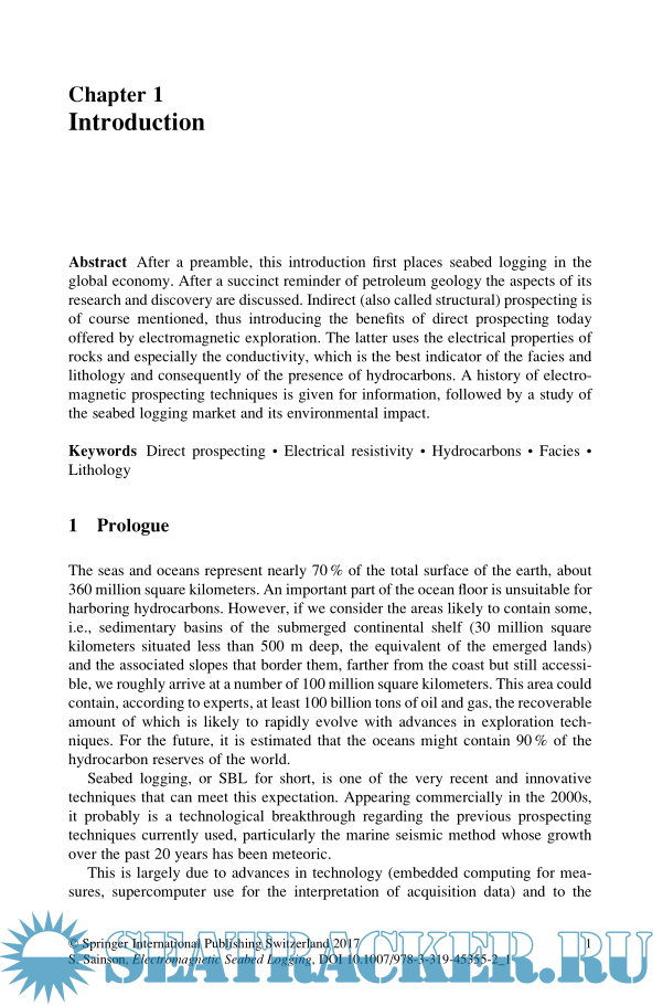 Year: 2017 Language: english Author: Stéphane Sainson Genre: Textbook Publisher: Springer International Publishing Edition: 1 ISBN: 978-3-319-45355-2 Format: PDF Quality: eBook Pages count: 549 Description: Seabed logging (SBL) gathers the electromagnetic methods of marine subsoil exploration and more specifically those dedicated to the exploration of oil and gas at sea. Appeared in 2000, these techniques, with more than 500 industrial jobs, present after 15 years of commercial success a discovery record rate of nearly 90 % and seem now to turn the world in the offshore exploration field. Proposing a serious index of the presence of hydrocarbons , electromagnetic SBL coupled with seismic reflection survey is probably the first reliable method for direct detection of hydrocarbons. Complementing the structural concepts of oil exploration used since the 1920s, the SBL now radically modifies the approach and the philosophies of exploration especially those then including drilling and well logging activities. Electromagnetic Seabed Logging: a new tool for oil and gas prospecting, which original publication in French was in 2012, presents these methods, its principles, advantages, limitations, instruments, modeling and applications. It is also designed to be a tool for a reflection on the use of electromagnetic energy for the exploration in a conductive medium as sea water thus setting the theoretical and practical limits of these investigations for future developments. This book is intended of course for the geophysicists and the petroleum geologists, but also for the earth scientists, the reservoir engineers and the log analysts. “The book provides a good overview of marine EM methods and their application for those starting out in the subject or wanting to learn more about the principles and practice. For specialists or those who want to dig further into the ideas that are discussed, there is an extensive bibliography, which is in itself extremely useful.” (Lucy MacGregor, The Leading Edge, October, 2017) Additional info: Translated from French by Linda Sainson M.Sc.