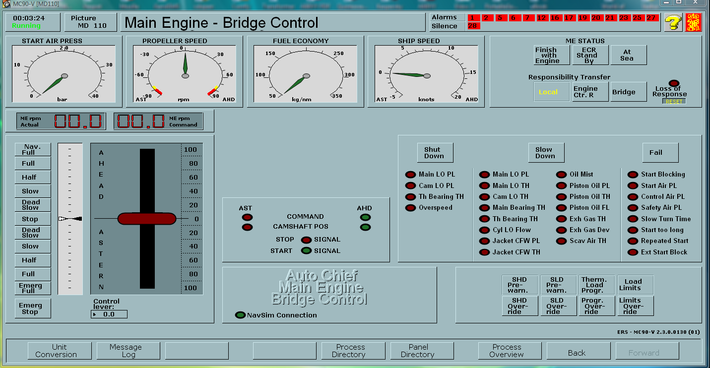 Description: The ERS-L11 MAN B&W 5L90MC–VLCC simulates a very large crude carrier with a MAN B&W slow speed turbo charged diesel engine as propulsion unit modelled with fixed and controllable propeller.