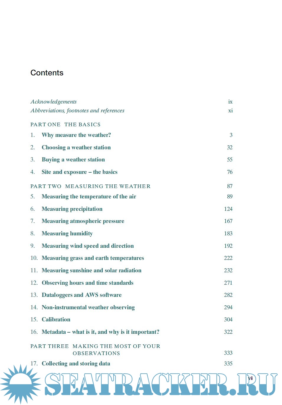 Topics on traditional and modern weather instruments are covered, as well as how best to choose and to site a weather station, how to get the best out of one's equipment, how to store and analyze weather records, and how to share observations with other people and across the Internet. The guide follows the World Meteorological Organization recommendations on observing methods and practices, and focuses on procedures to accurately measure the weather variables.