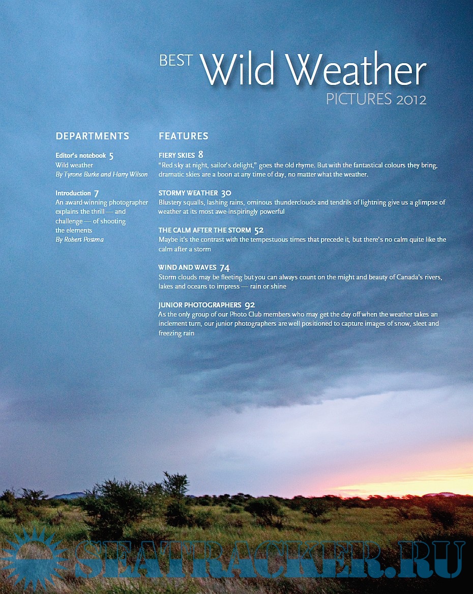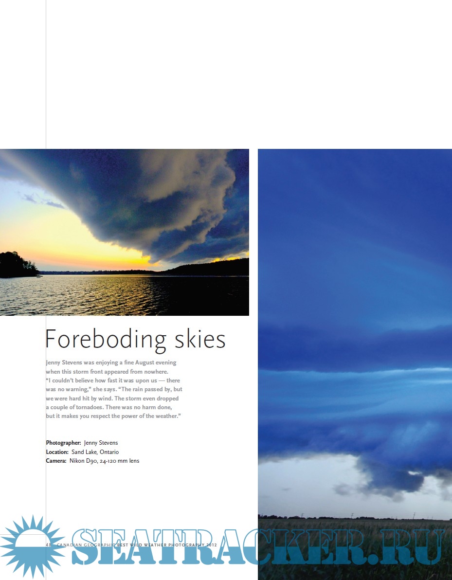 Year: 2012 Language: english Author: Canadian Geographic Genre: Periodical (magazine) Publisher: Canadian Geographic Format: PDF Quality: eBook Pages count: 100 Description: Weather is something we are used to living with from birth, no matter if we are on land, at sea or in the mountains. It changes very quickly, in minutes, so that sometimes it's challenging to freeze a moment in a picture. This book is a collection of the best weather and nature pictures from Canadian Geographic (2012). Selected from annual Canadian Geographic's annual photo contest, they provide a good look onto some of wildest and most spectacular events: lightning strikes, skies painted tones of red or bruised blues and purples, crashing Great Lakes waves and storms. Topics are arranged in thematic chapters: Fiery skies, Stormy weather, The calm after the storm, Wind and wawes, and junior photographers. Each picture has a brief caption and note.