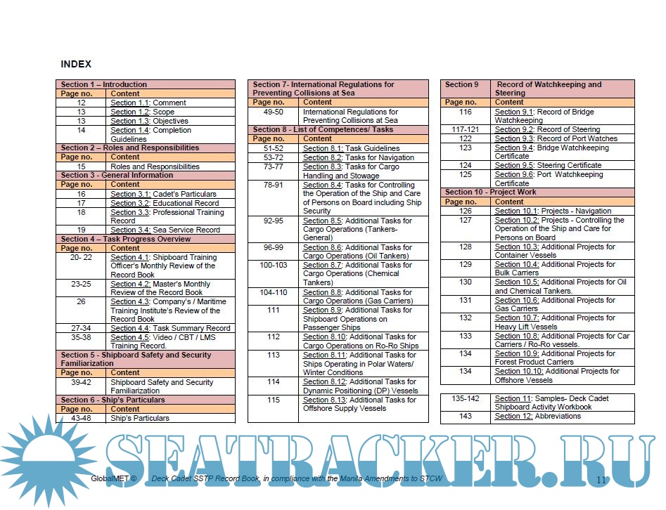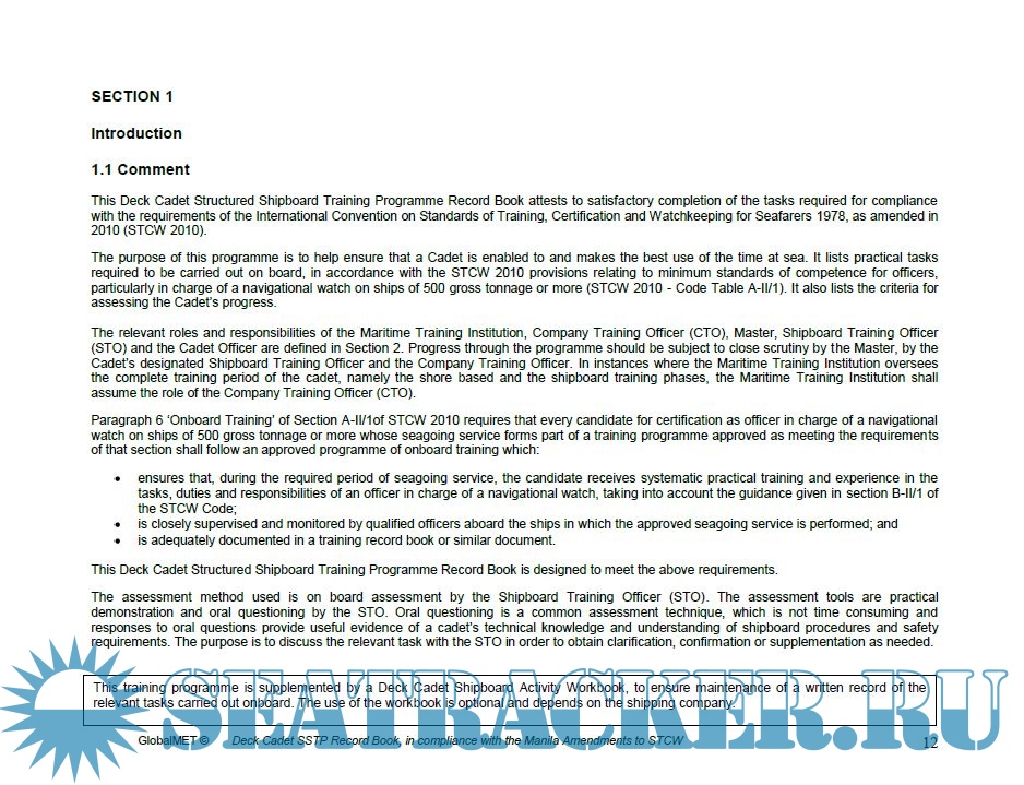 The book is designed to provide deck cadets with a practical, structured, onboard training programme that covers the requirements of STCW 2010. The level of knowledge, understanding and proficiency required is to be sufficient for watchkeeping and other onboard duties to be effectively carried out. It is recognised that the development of competence in activities difficult to teach in the onboard environment will need the support of shore-based teaching. The programme of onboard training is an integral part of the overall training plan. The comprehensive provisions in the book enable a cadet to complete appropriate tasks prior to joining a ship if circumstances permit. In this case, provided the Cadet can produce evidence of having successfully completed the task, the Shipboard Training Officer (STO) may sign the „considered proficient‟ column following oral questioning and without requiring full performance of the task.
