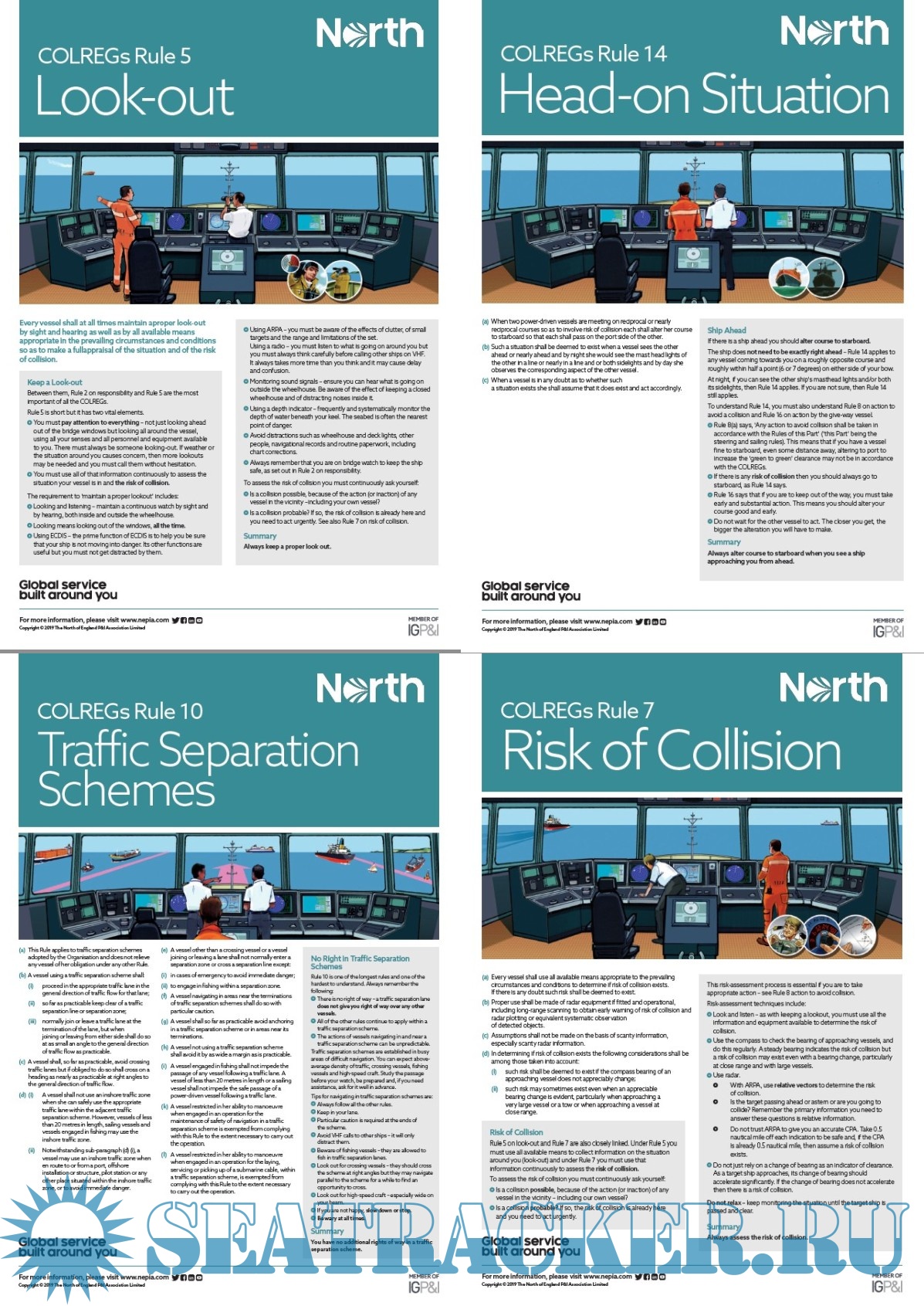 Description: North is a marine insurer company focused on safety culture and loss prevention, that also provides technical and operational expertise. These publications are on navigational safety and COLREGs correct interpretation. Each COLREGs Rule is illustrated, explained and briefly commented in a single leaf, intended as a "poster", that can be printed and kept on hand on the deck, ready for reference. Comments not only recall correct interpretation of the rule, but also provides clear explanations, with examples of misinterpretations which can lead to danger. Topics cover Rules 2, 5, 6, 7, 8, 10, 13, 14, 15, 16, 17, 19.