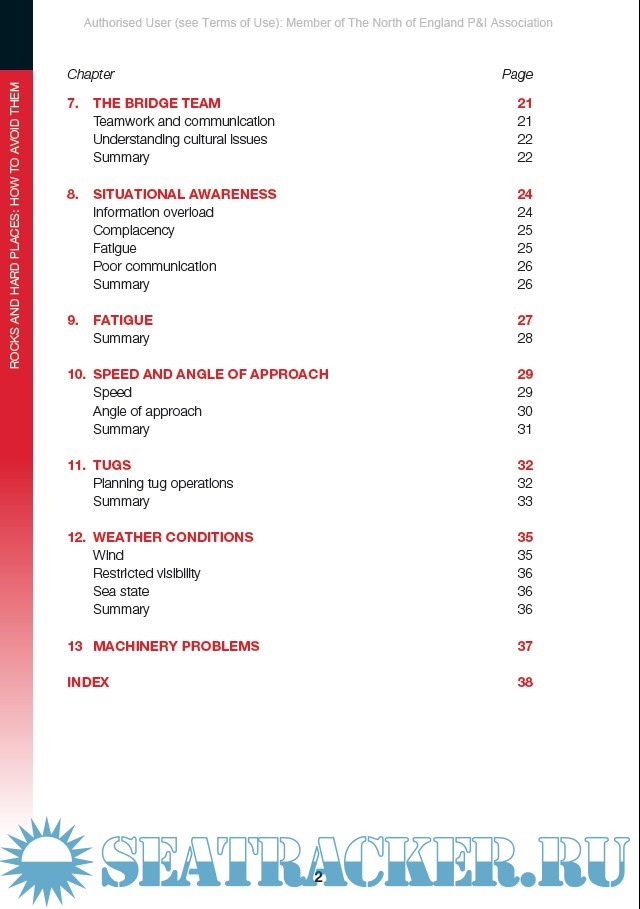 Year: 2015 Language: english Author: North of England P&I Association Genre: Handbook Publisher: North of England P&I Association Format: PDF Quality: eBook Pages count: 43 Description: Groundings and collisions with both fixed or floating objects (FFO) are the most high profile and costly of all maritime accidents. Usually human error remains the most common factor of such accidents. Even if vessel’s navigational systems and procedures are designed to reduce the risk, it is precisely the failure of these procedures that lead to incidents. North is a marine insurer company focused on safety culture and loss prevention, that also provides technical and operational expertise. This guide is designed to bring to the attention of masters and officers the key factors in groundings and FFO incidents, rather than be a textbook on voyage planning and the avoidance of groundings or FFO incidents. It includes suggestions on avoiding the contributory factors and aims to promote an understanding of how the risks can be minimised through following good practice. Real-life case studies are included at the end of most chapters to provide examples of poor practice, considering that is much less costly to learn from the mistakes of others than to learn from our own mistakes. The case studies and the questions they ask are designed to be the starting point for wide-ranging discussions on all aspects of avoiding groundings and FFO incidents. Each case study describes a developing situation and asks a number of questions, without providing the answers. The intention is to encourage the discussion between members of the bridge team.